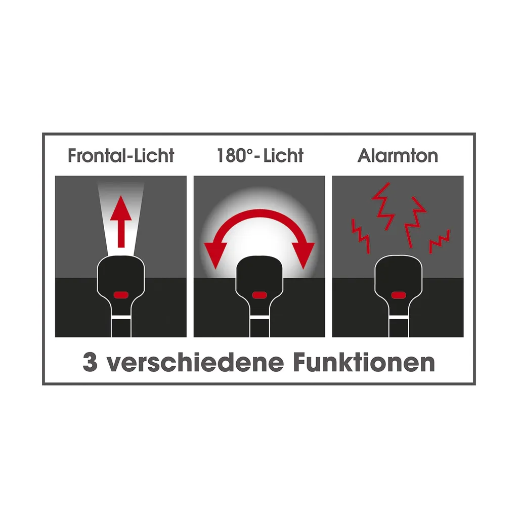 Drei Funktionen (Frontallicht, 180° Licht, Alarmton)