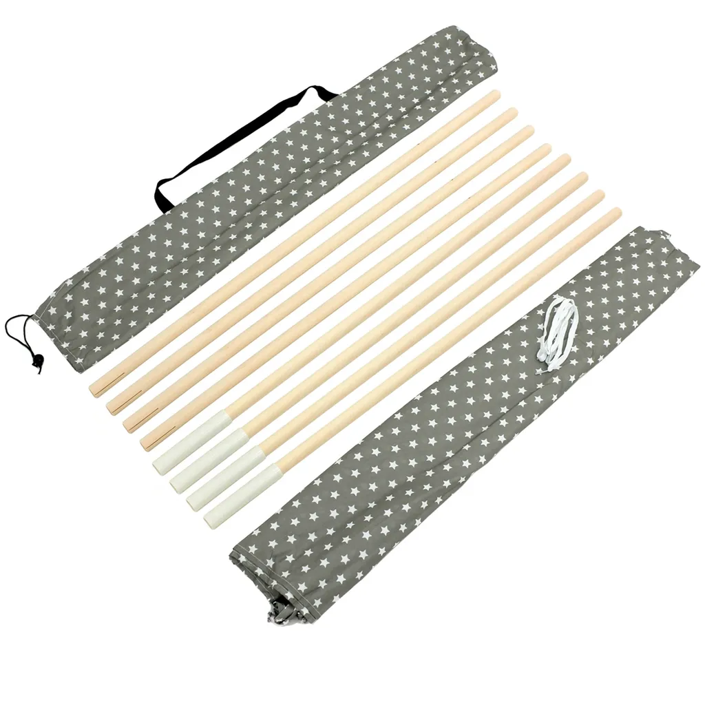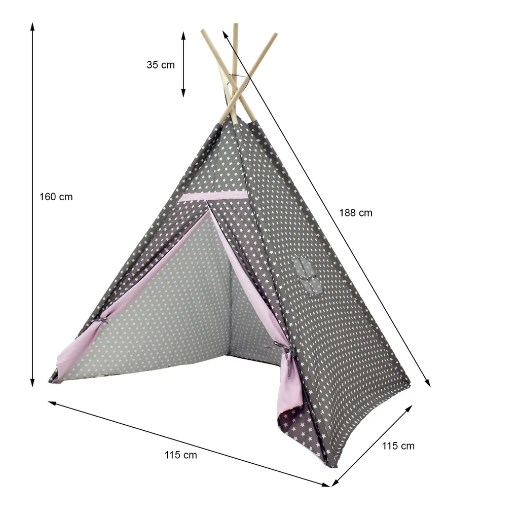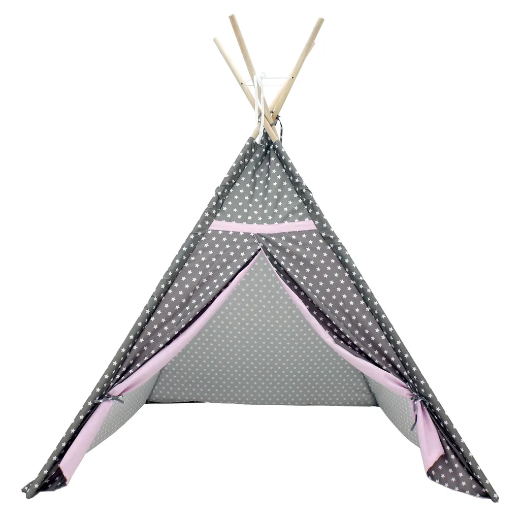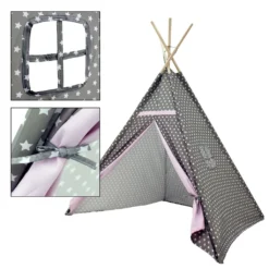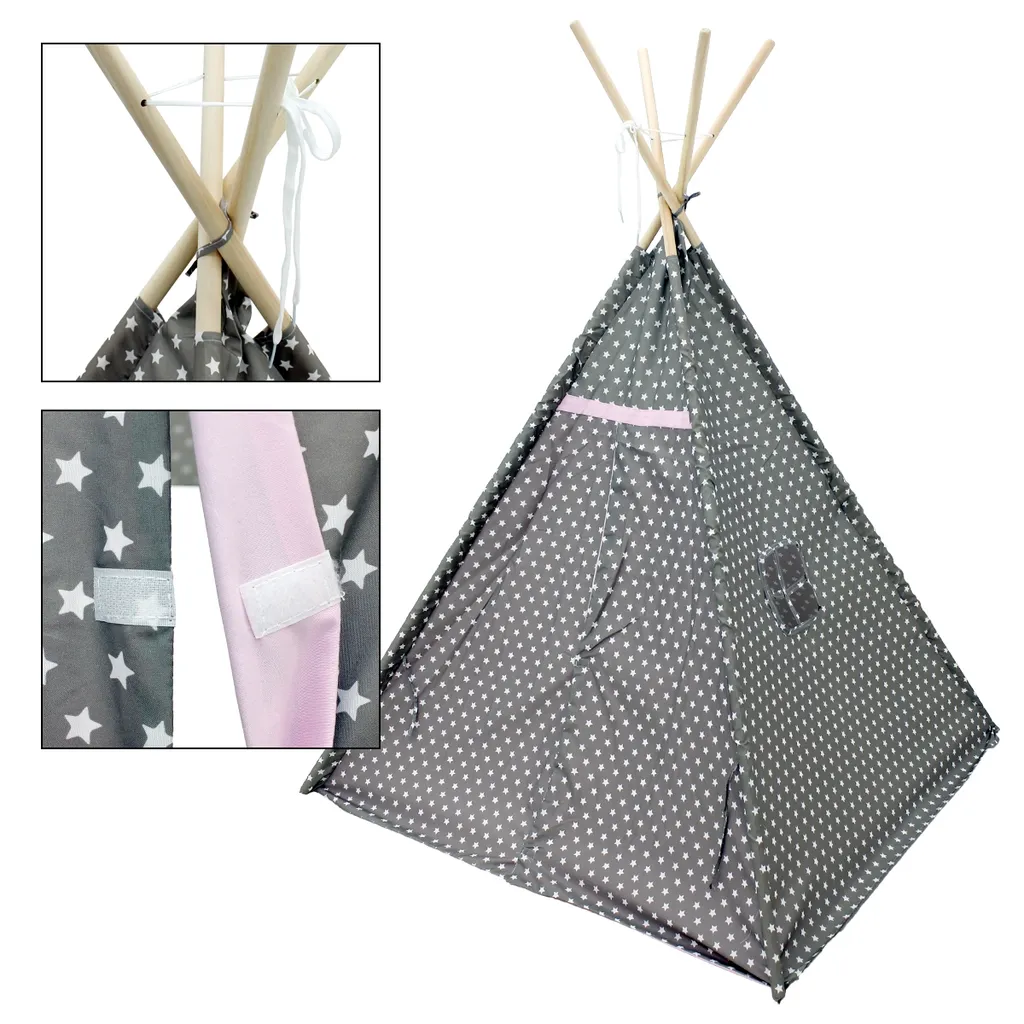 Das hübsche Design aus naturbelassenem Holz und grauem Stoff mit Sternen und rosa Zelttüren ist in jedem Raum ein schöner Hingucker – egal ob Kinder- oder Wohnzimmer. Das Tipi ist mit seiner gemütlichen Atmosphäre und dem kleinen Fenster der ideale Ort zum Spielen, Verstecken und Träumen. Dank der praktischen Tragetasche im gleichen Design und der kinderleichten Montage ist das Zelt auch an warmen Sommertagen ein perfekter Sonnenschutz im Garten oder am Strand.