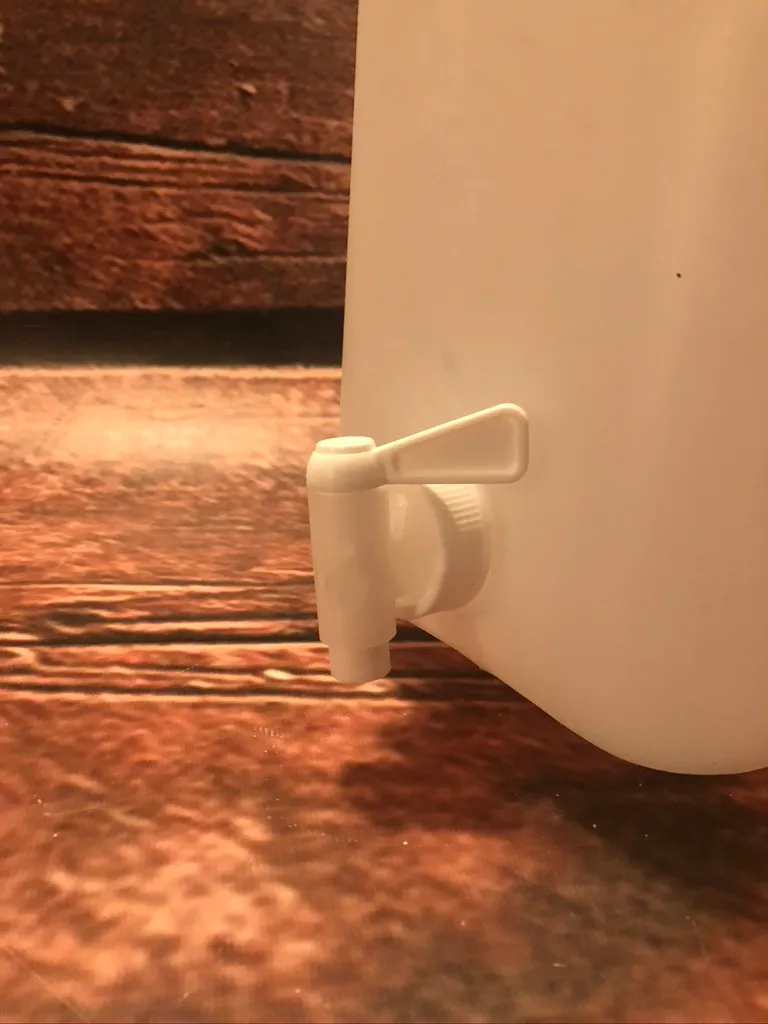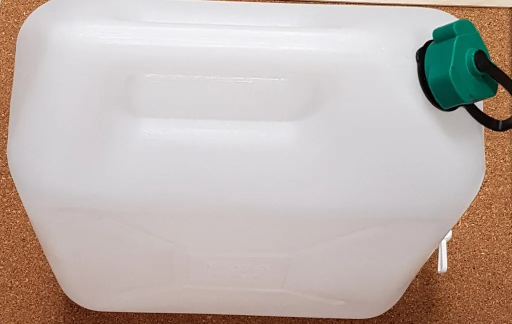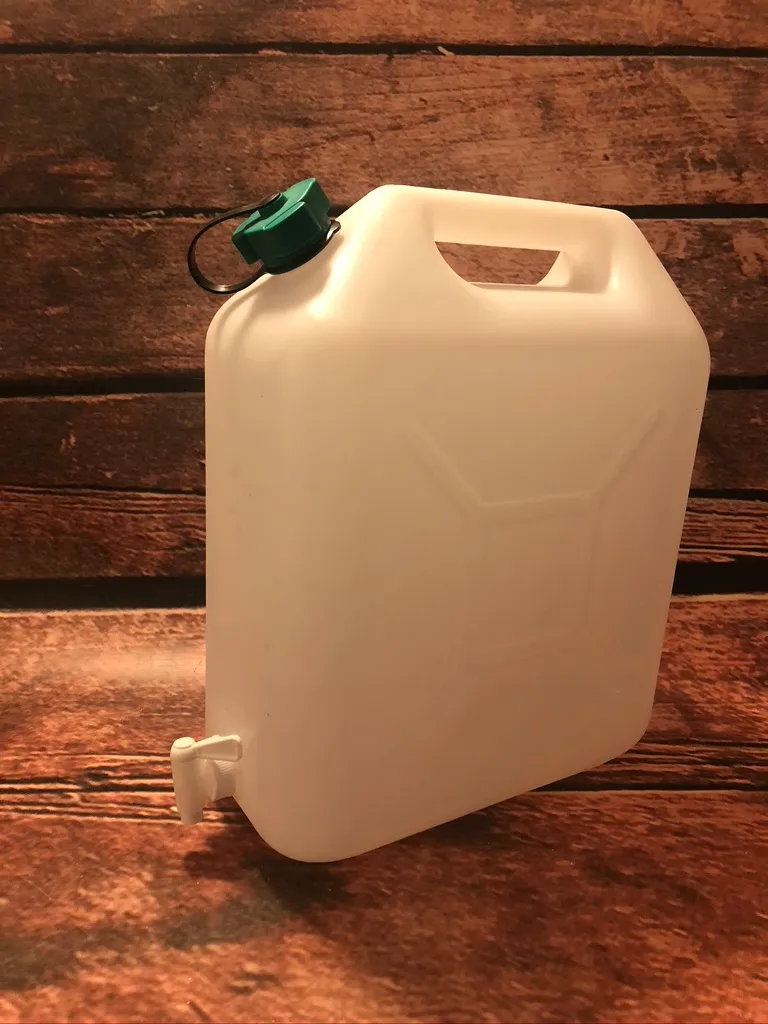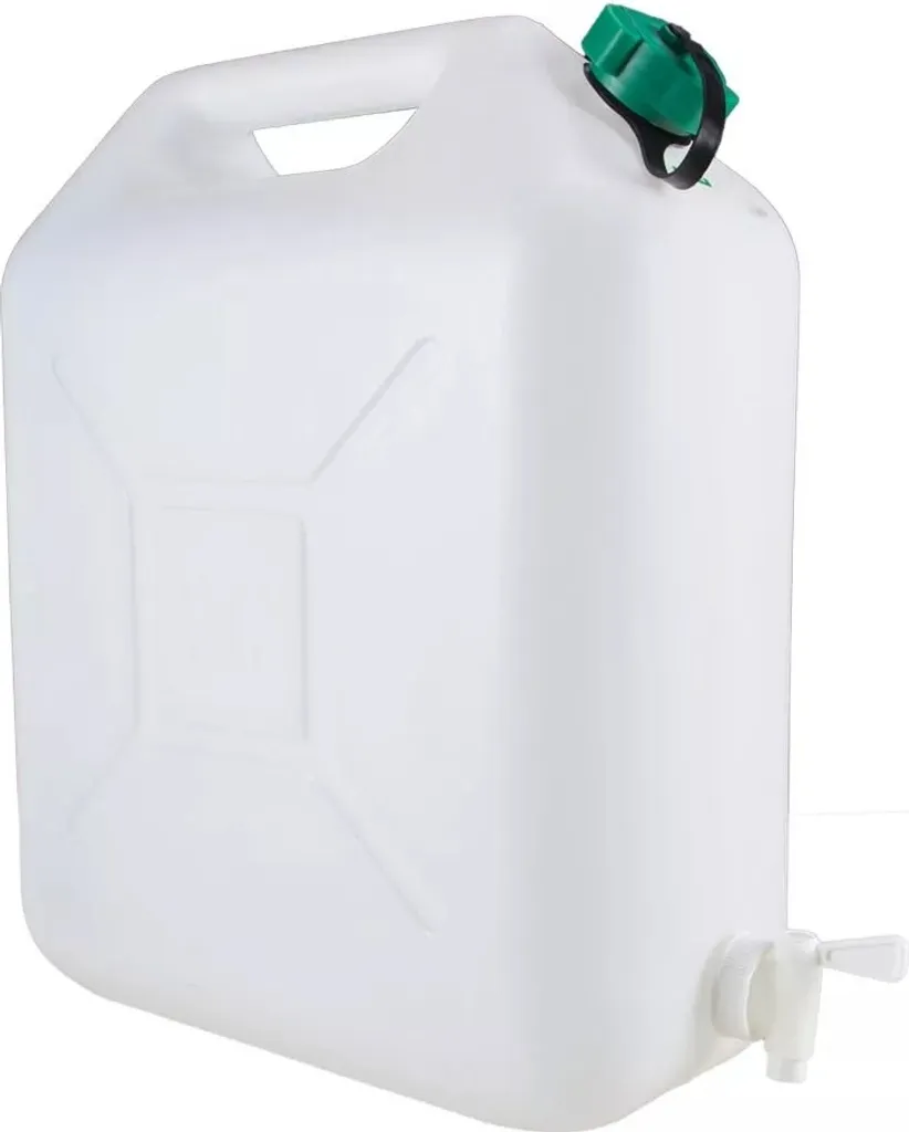 Ein Wasserkanister mit einem Wasserhahn und einer Wasserspeicherkappe.