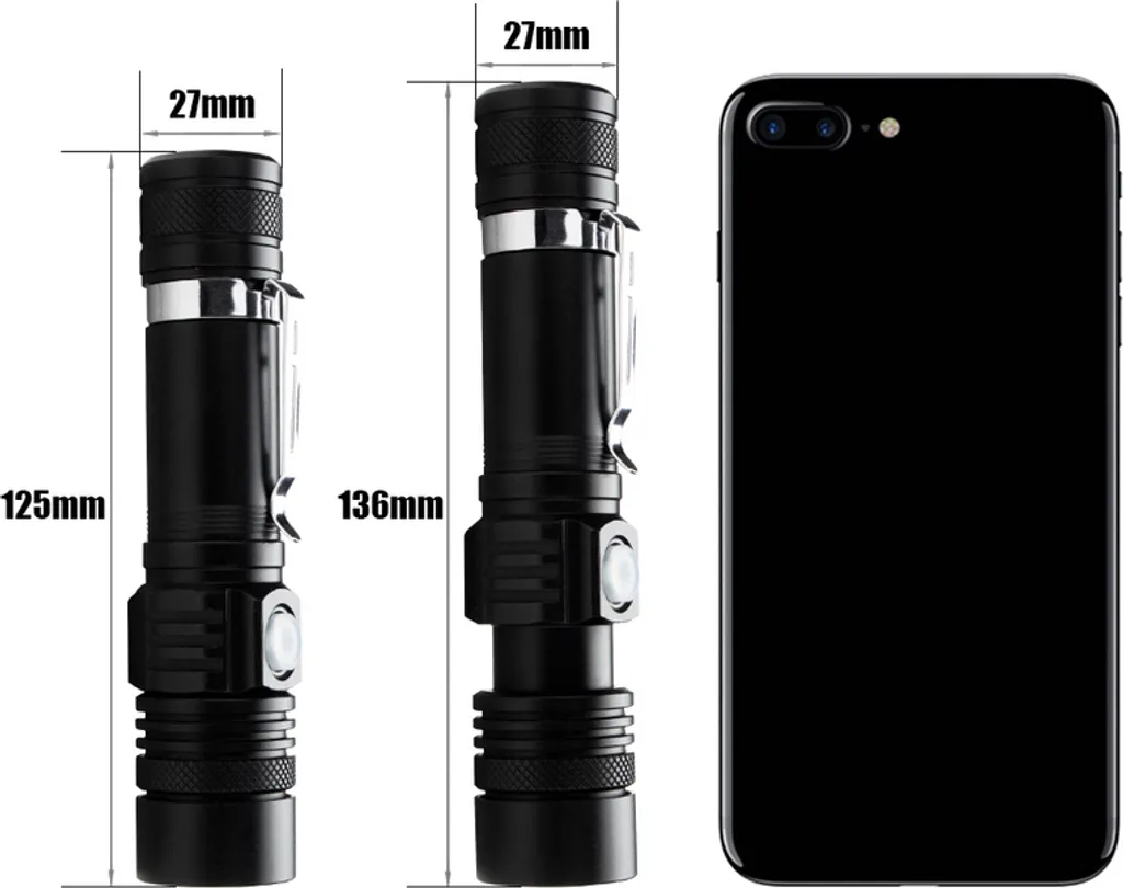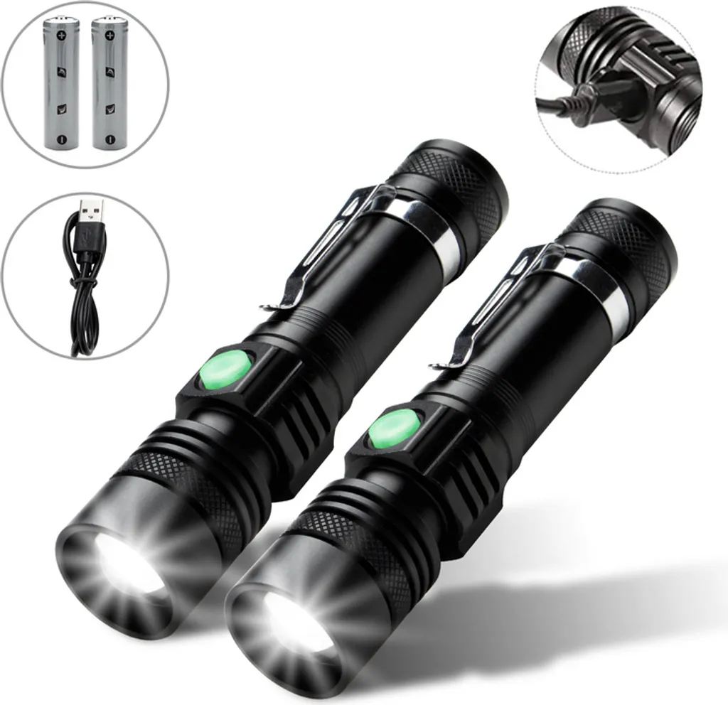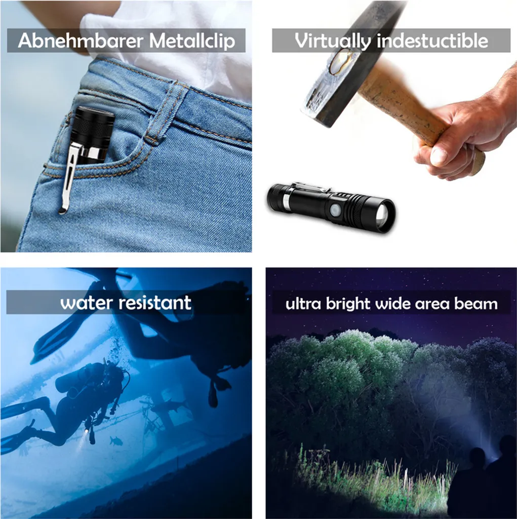Die Taschenlampe ist mit einem USB-Kabel und einem 18650-Lithium-Ionen-Akku ausgestattet, die per Computer, mobilem Netzteil, Netzteil und Autoladegerät aufgeladen werden können. Leichtes und kompaktes Design, sehr leicht zu tragen.