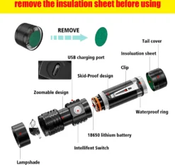 Diese wiederaufladbare Taschenlampe verwendet IPX4-wasserdichtes Design unter fast allen Bedingungen (von starkem Regen bis zu trockenen und staubigen Umgebungen). Das rutschfeste Design hat einen soliden Aluminiumkörper und eine Schlagfestigkeit, die einer harten Handhabung standhält.
