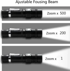 - 4 einstellbare Modi: High / Low / Strobe / SOS, wodurch die Schwierigkeit, zwischen 5 Modi zu wechseln, effektiv verringert wird. Die Taschenlampe kann den Durchmesser des Lichts oben einstellen und durch Drehen im oder gegen den Uhrzeigersinn einstellen. Alles bringt Ihnen die beste Benutzererfahrung!