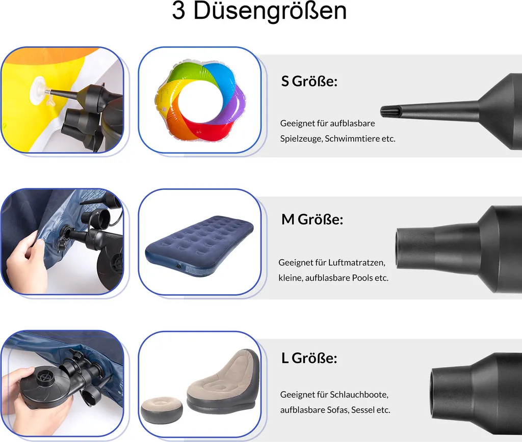 - mit 3 verschiedenen Adaptern zum Auf- und Abpumpen