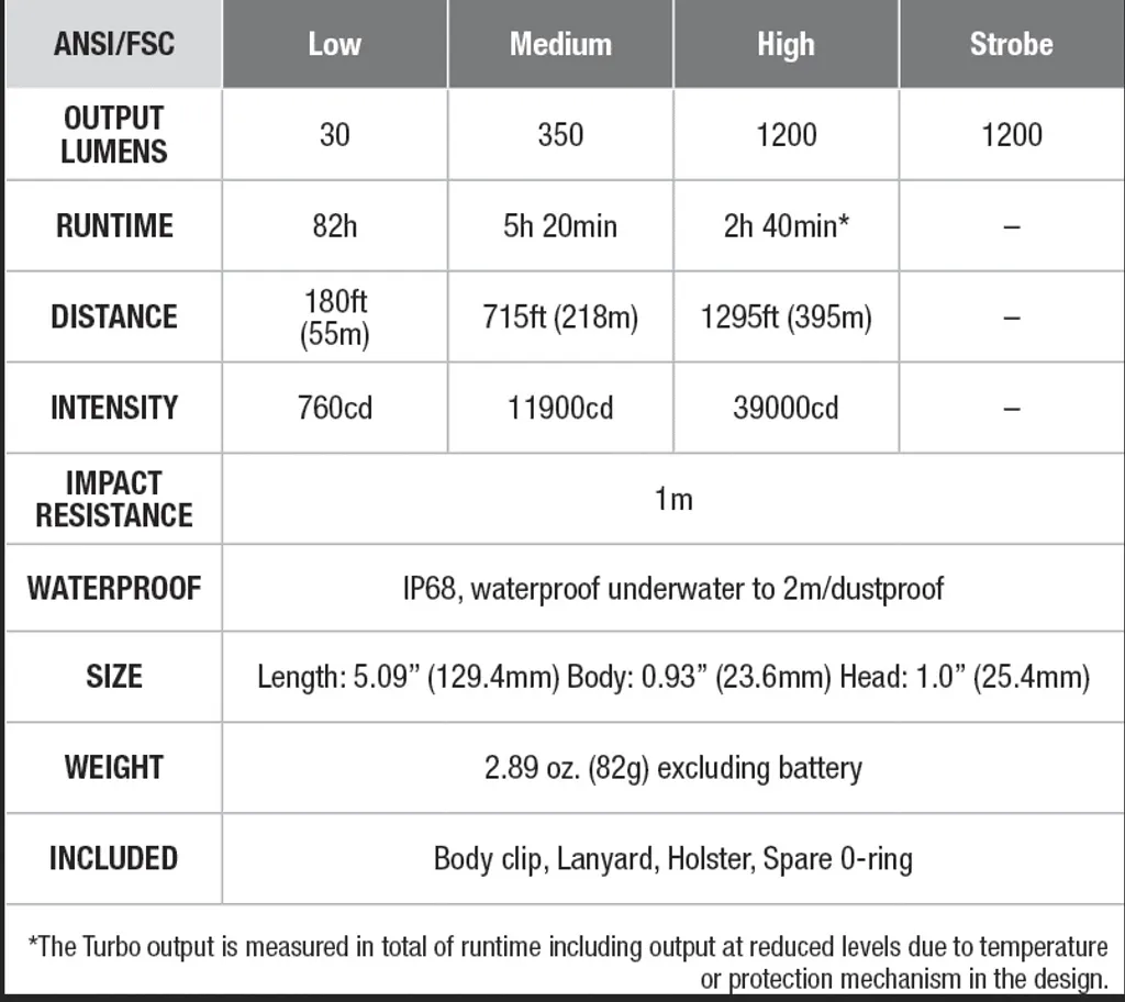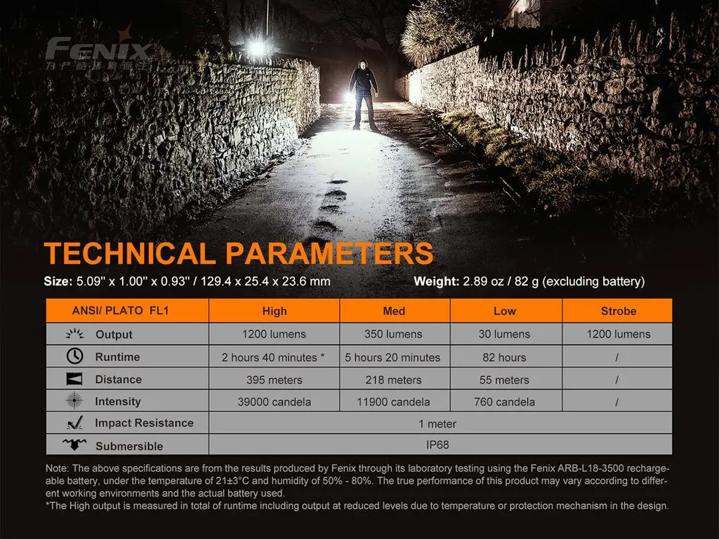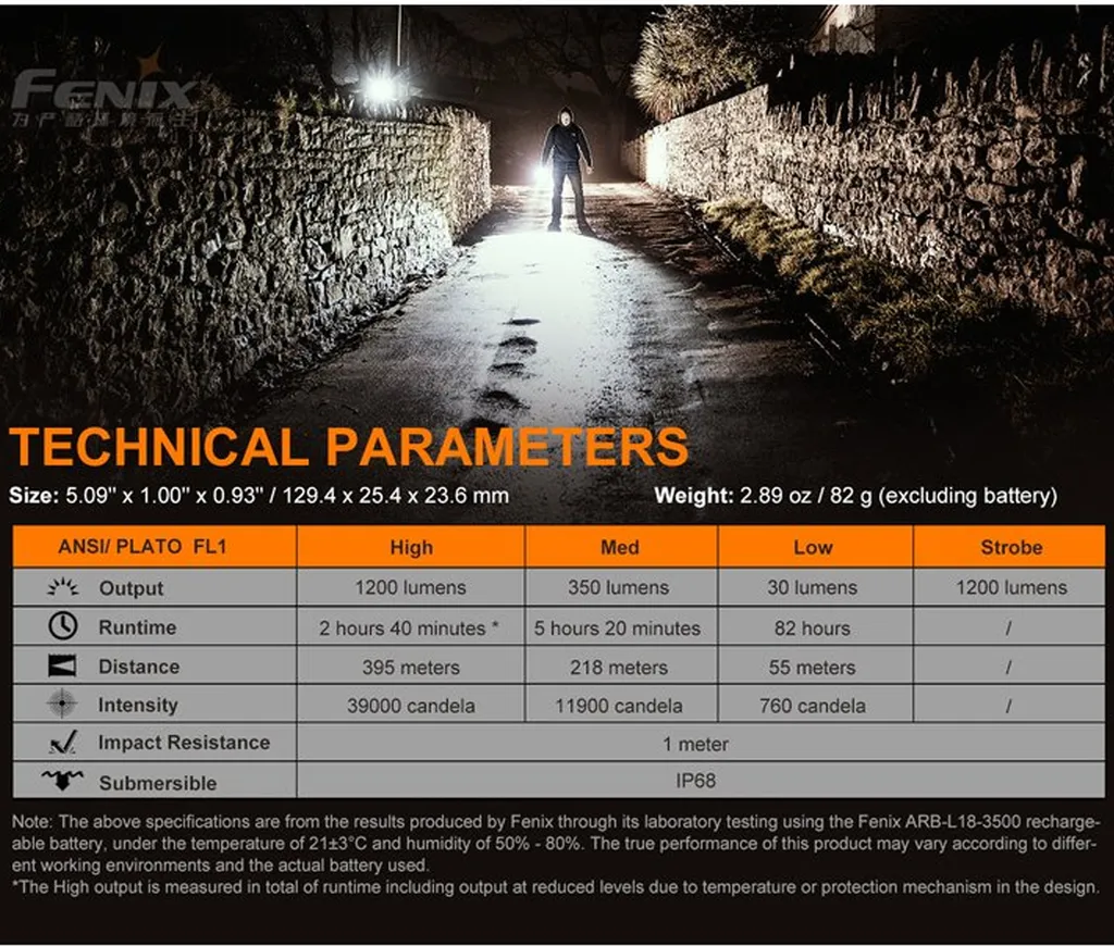 Hinweis: Gemäß dem ANSI/PLATO FL1 Standard sind die zuvor genanten Werte im Fenix Labor bei bei 21°C±3°C, 50%-80% Luftfeuchtigkeit und dem Fenix ARB-L18-3500 Akku ermittelt. Die Werte können je nach verwendeter Taschenlampe, Akku / Batterien, Alter und Umgebung abweichen.