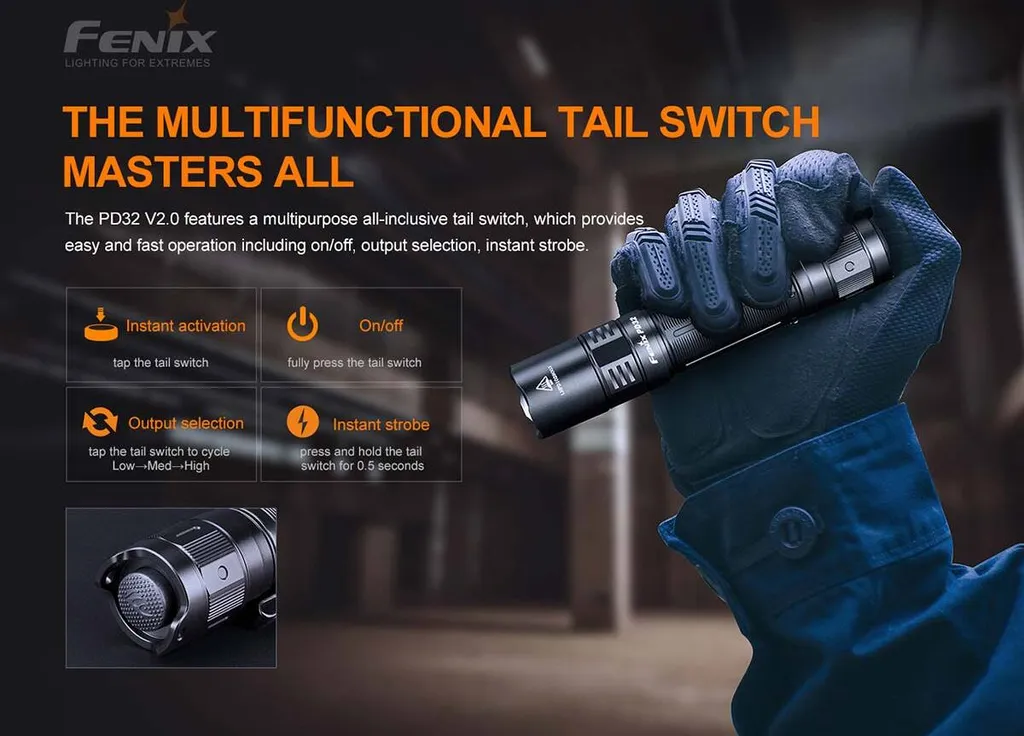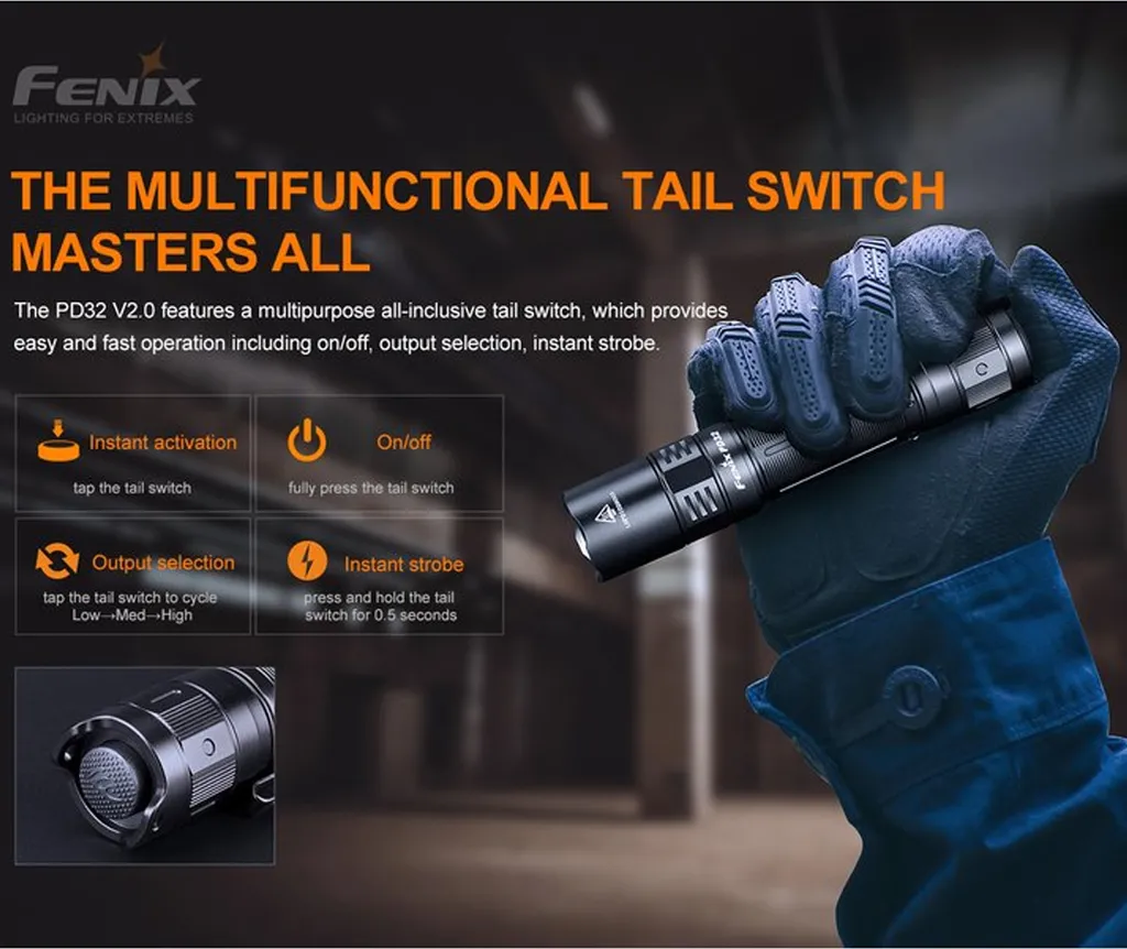Die Fenix PD32 V2.0 LED-Taschenlampe ist eine Allround-Taschenlampe mit einem kompakten Gehäuse. Dieses Hochleistungslicht erreicht 1200 Lumen und kann bis zu 395 Meter weit leuchten. Betrieben wird sie mit einem 18650 Li-Ionen-Akku oder zwei CR123As. Insgesamt drei Helligkeitsstufen sowie dem Strobe-Modus sorgen für eine gute Anpassung. Simples Drücken und Halten des Endschalters sorgt für schnelles Ein- Ausschalten bzw. den Leuchtstufenwechsel. Das alles natürlich einhändig! Die vielseitige LED-Taschenlampe PD32 V2.0 eignet sich perfekt für den täglichen Gebrauch, Wanderungen, Camping und Aktivitäten im Freien und ist leistungsstark genug für Strafverfolgung, Suche und Rettung.