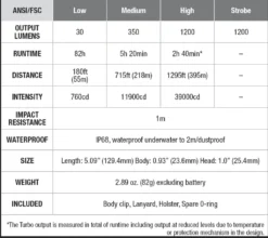 Kompakte Taschenlampe mit 1200 Lumen und 3 verschiedenen Leuchtmodi und Stroboskop. Der taktische Heckknopf ermöglicht eine schnelle und vereinfachte Auswahl der Lichtstrahlmodi. Geeignet für den professionellen Einsatz durch militärische Einrichtungen, Sicherheitsbeamte und Liebhaber von Outdoor-Aktivitäten. – Gehäuse: schwarz eloxiertes Luftfahrtaluminium mit abriebfester Oberfläche – Linse: ultraklares gehärtetes Glas mit Antireflexbehandlung – Leistung: 30–350–1200 Lumen – Blitz – LED: Cree XP-L V5 (Nutzungsdauer 50.000 Stunden) – Kompatibel mit der Tastenfernbedienung AER-02 – Seitliche Taste für Ausgangswahl und taktisches Ende für momentane Funktion – Digital geregelter Ausgang, behält konstante Helligkeit bei – Intelligente Speicherschaltung: behält die zuletzt gewählte Leistungsstufe bei – Maximale Intensität: 39000 cd – Maximale Sichtbarkeit: 395 m – Autonomie: 82 Std. bei 30 Lumen, 2 Std. und 40 Min. bei 1200 Lumen – Stromversorgung: 2 CR123A-Batterien oder 1 wiederaufladbarer Li-Ionen-Akku 18650 – Kompatibles Zubehör: ALG-00, ALG-05, ALP-10, AER – 02 V2.0 – Wasserfestigkeit: nach Standard IP68 (bis 2 m) – Stoßfestigkeit bis: 1 m – Abmessung: 12,9 cm (Länge) x 2,36 cm (Ø Körper) 2,54 (Ø Kopf) – Gewicht: 82 g (ohne Batterien).