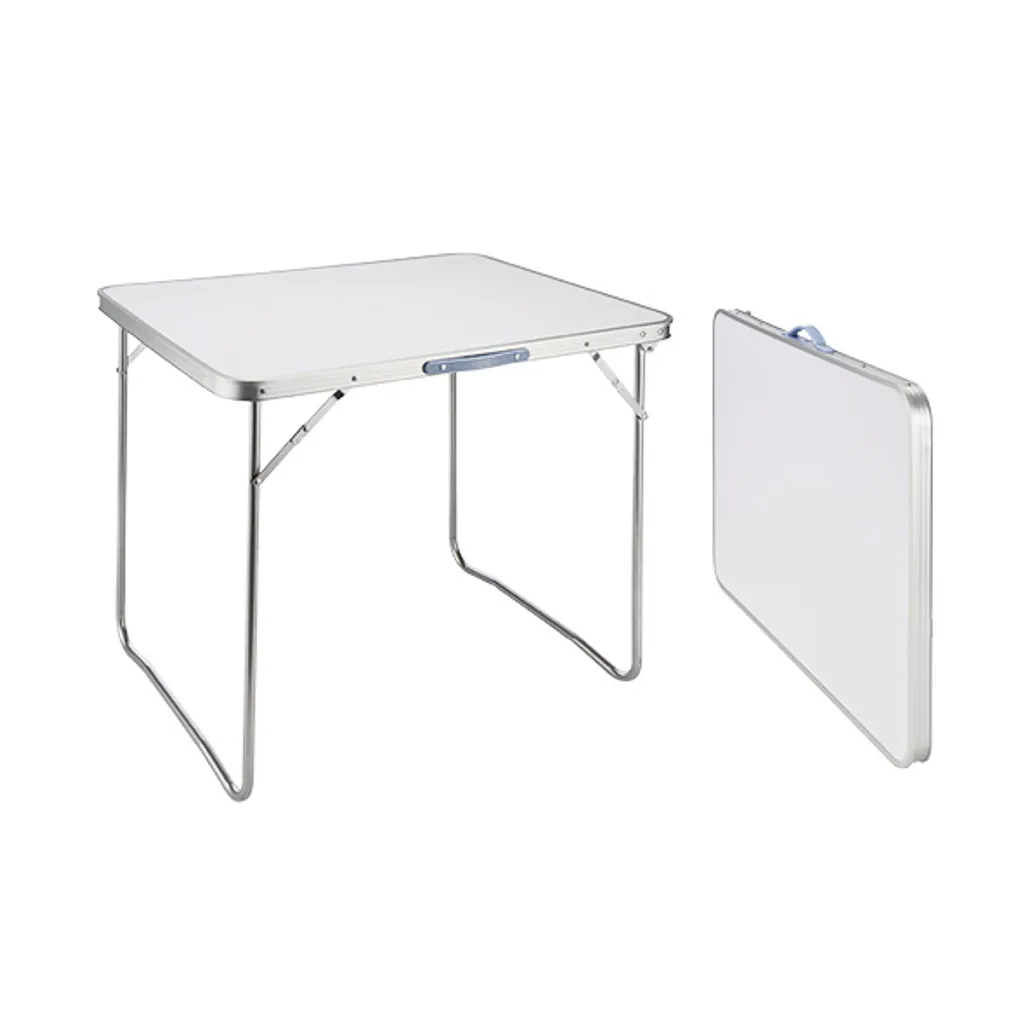 Praktischer klappbarer Campingtisch. Unverzichtbar beim Camping, aber auch praktisch als Beistelltisch im Garten bei einer Party oder beim Grillen. Der Tisch nimmt wenig Platz ein, da er zusammenklappbar ist. Ausgeklappt hat er die Maße 80x60x69cm. Die Platte ist weiß und besteht aus 4 mm starkem MDF.