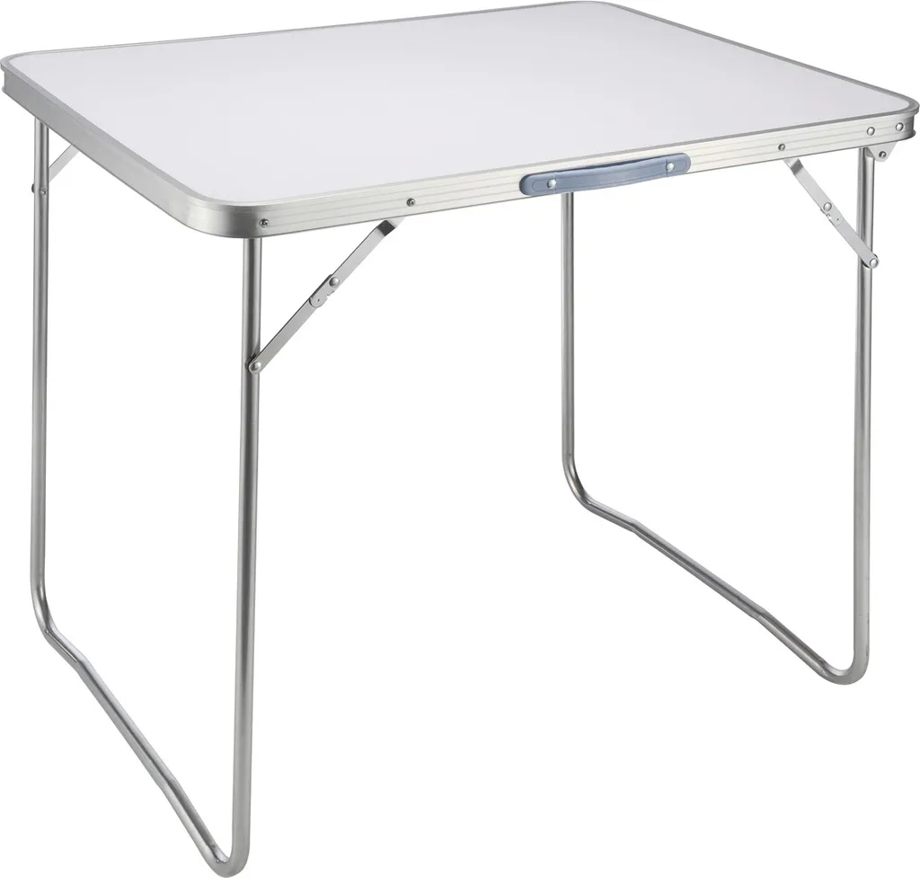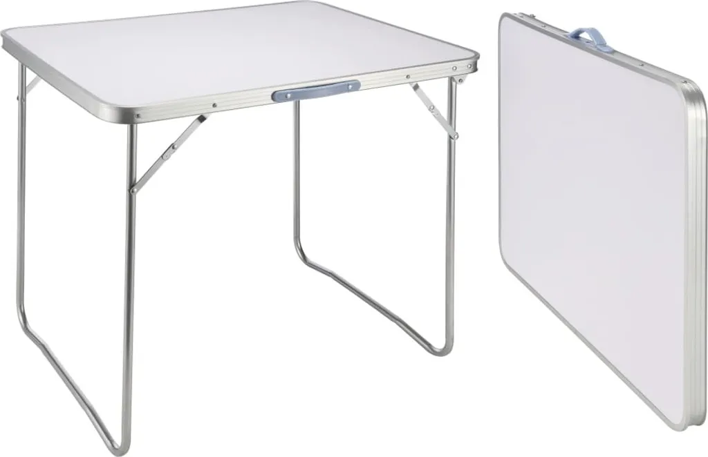 Der Campingtisch hat eine weiß lackierte MDF Tischplatte und ist zum einfachen Transport mit einem Tragegriff ausgestattet.