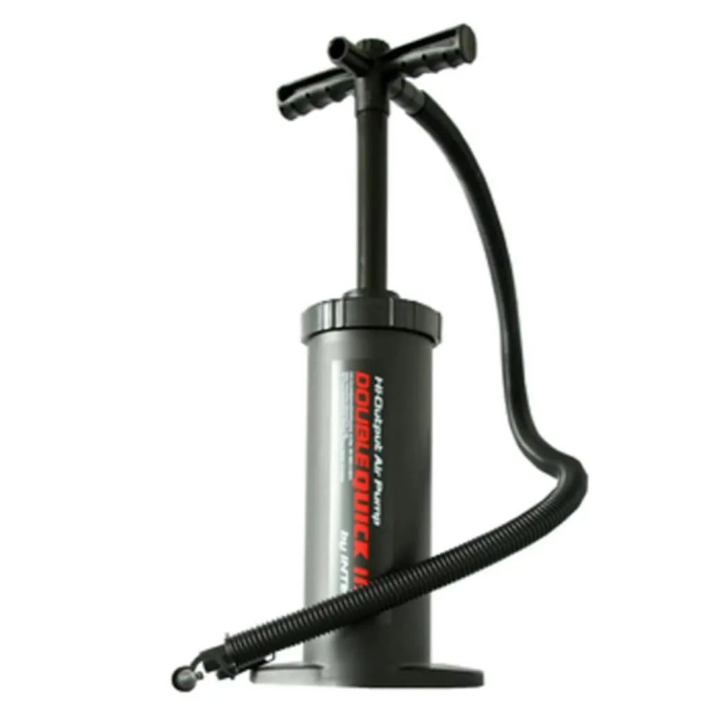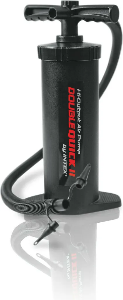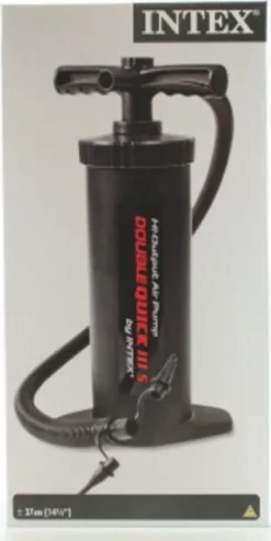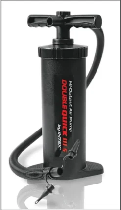 Der Intex Double Quick III S eignet sich zum schnellen Aufblasen und Entleeren von aufblasbaren Luftmatratzen, Booten, Kajaks und Superboards. Die Pumpe bläst Luft sowohl bei Auf- als auch bei Abwärtsbewegungen. Das bedeutet, dass das Pumpen doppelt so schnell ist. Die Intex Double Quick III S pumpt Luft dreimal schneller als die Intex Double Quick I. Die Handpumpe wird mit drei verschiedenen Düsen geliefert. Der Intex Double Quick III S hat eine Länge von 37 Zentimetern.