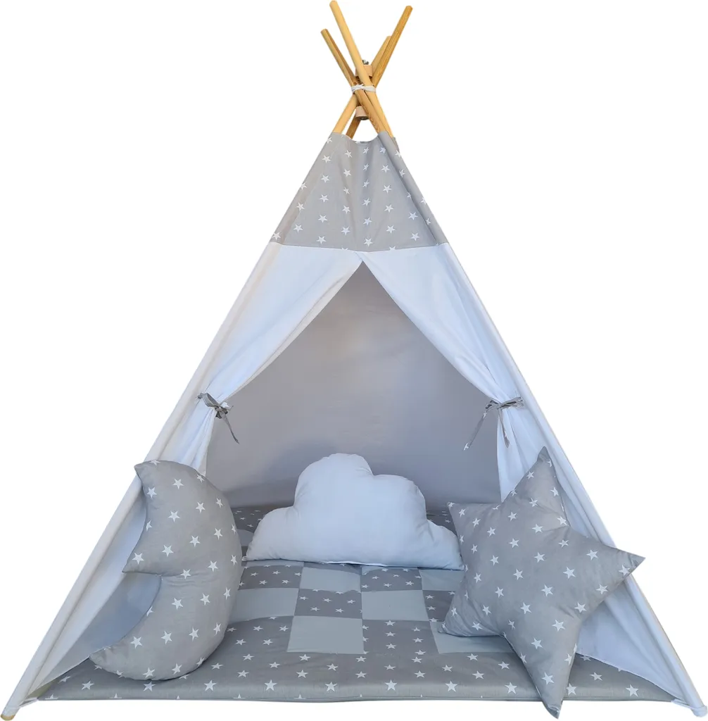 - Zelt aus 100% Baumwolle. Maße: Tipibasis: 120×120 cm, Höhe nach dem Aufschlagen: 145 cm, Farbe: Grau,Weiß , Like auf Fotos
