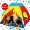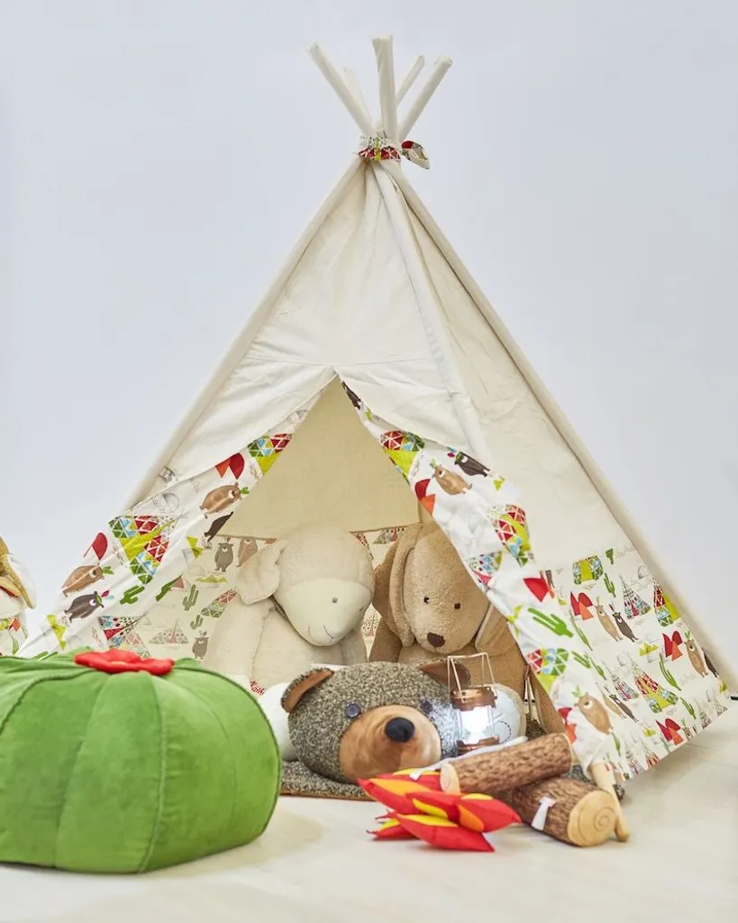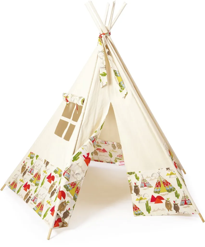 Unser Zimmerzelt aus hellem Stoff, bedruckt mit bunten Präriemotiven, lädt zum fantasievollen Spielen ein. Die Holzstäbe sind herausnehmbar, der Zeltstoff kann gewaschen werden, auch bei der Aufbewahrung spart es Platz. Das Fenster kann durch ein Stoffrollo verschlossen oder mit Klettverschlüssen offen gehalten werden. 150×180 cm