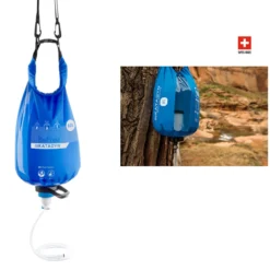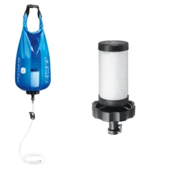 oder für den Zeltaufbau. Die Leistung des Filters ist abhängig vom Höhenunterschied zwischen Filter und Behälter. Das gefilterte Wasser wird in einem separaten Kanister, Wassersack oder einer Flasche aufgefangen.
