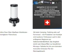 Das Herzstück des Katadyn Gravity Camp 6L ist das neu entwickelte Ultra Flow Filter™ Element das mit einer Durchflussrate von bis zu 2 Liter pro Minute zuverlässig Bakterien, Zysten und Sedimente (Porengrösse: 0,2 Mikron= 0,0002 mm) filtert.