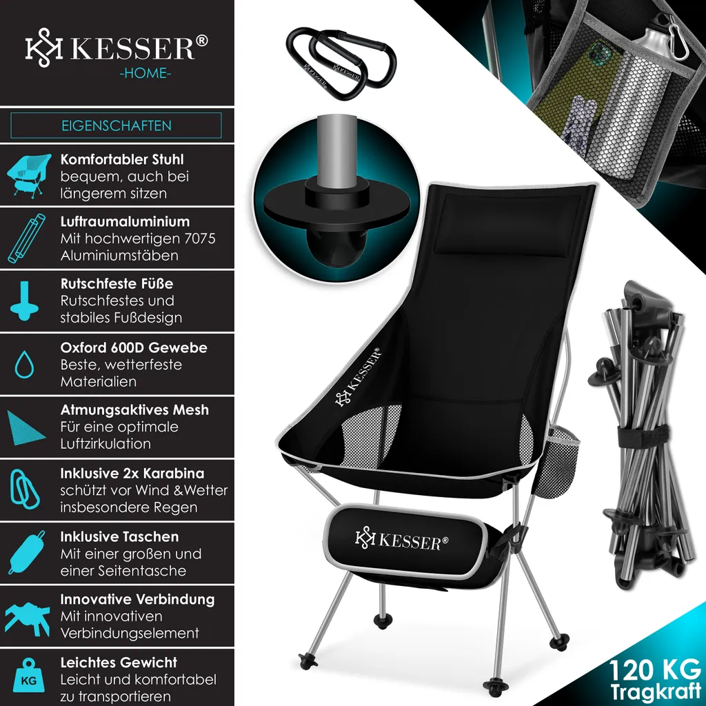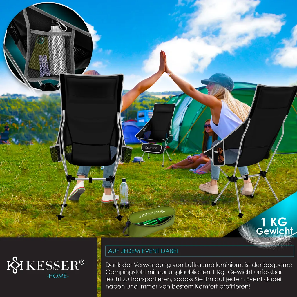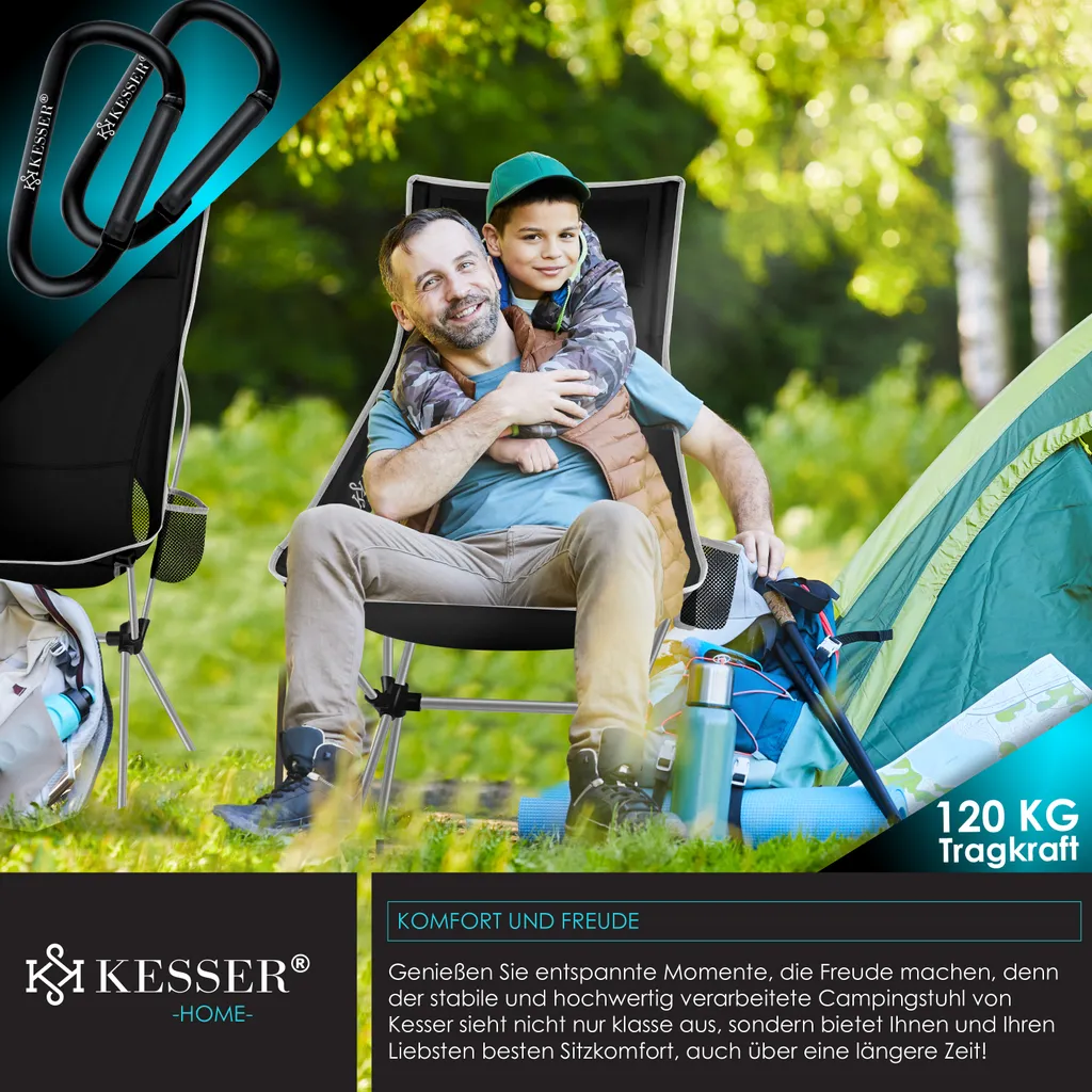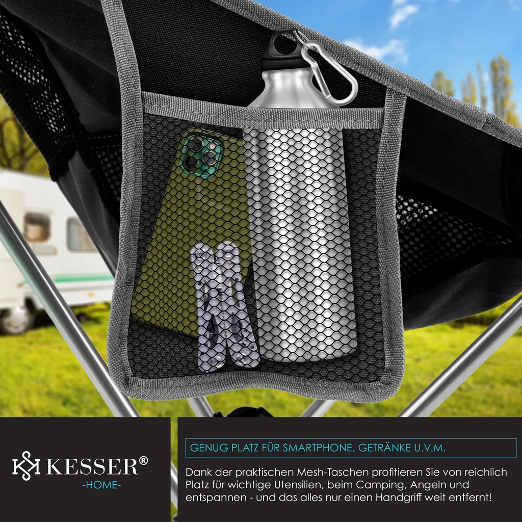 KESSER Campingstuhl aus einem atmungsaktiven Netz und wasserabweisendem Polyester, robustes Aluminiumgestell sorgt für eine Belastbarkeit bis 120Kg, Inkl. Extras wie integriertem Getränkehalter, Tragetasche, Seitentasche und Karabinerhaken