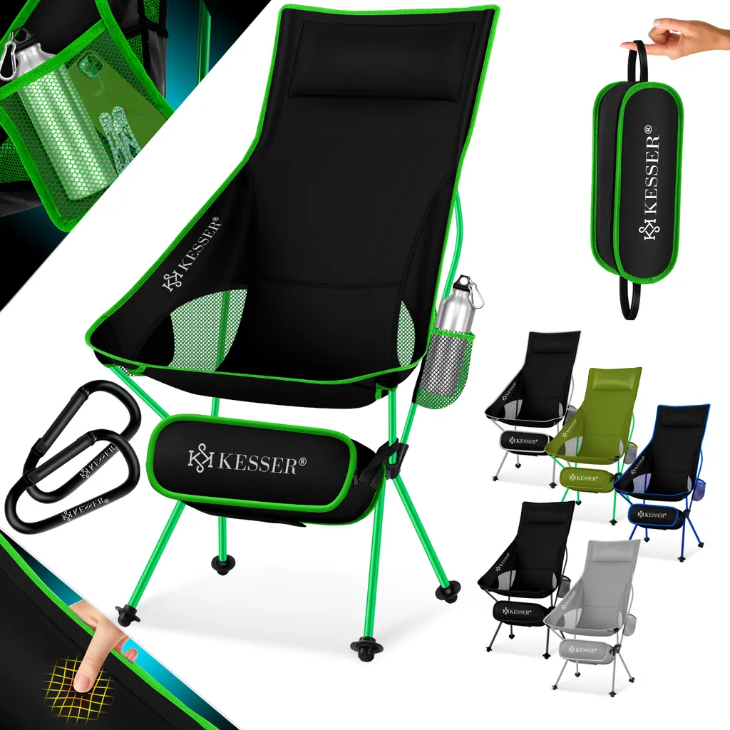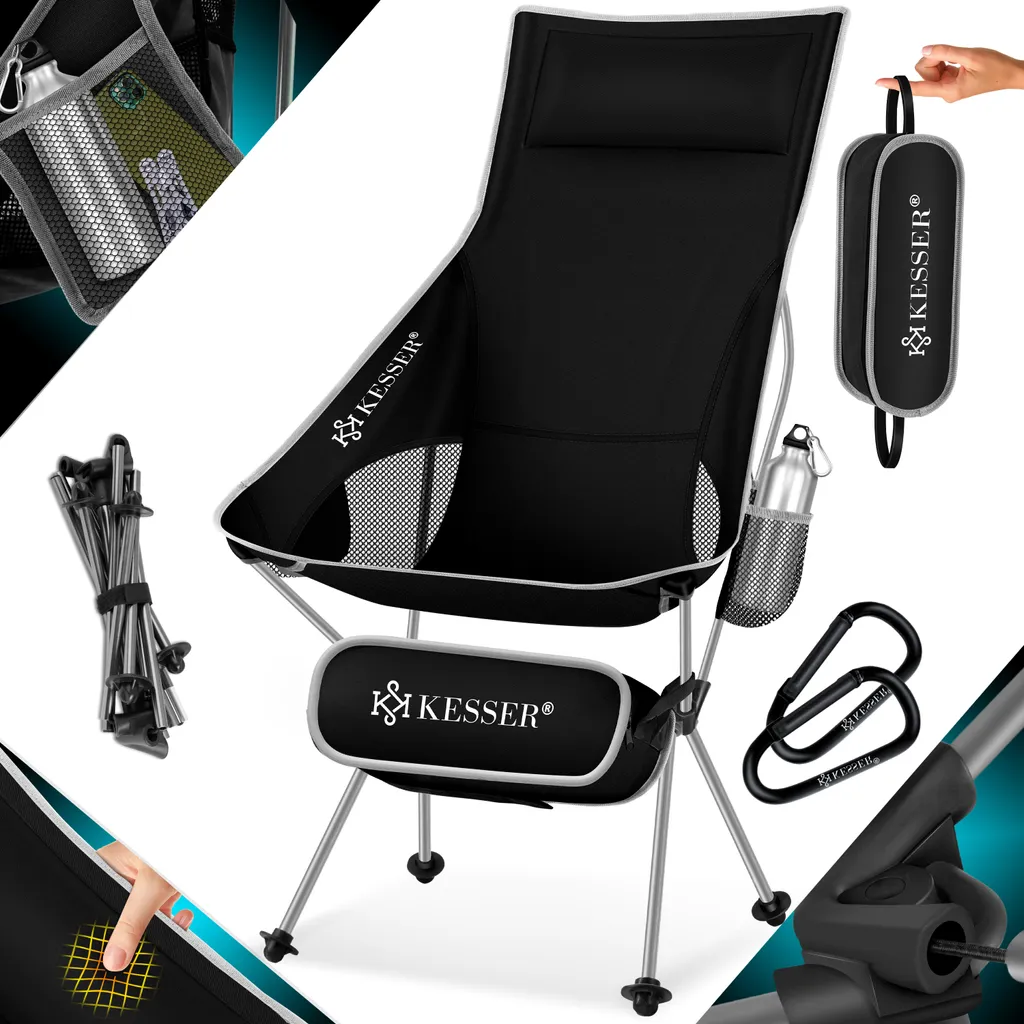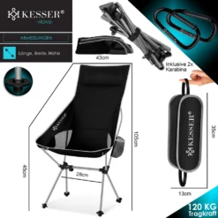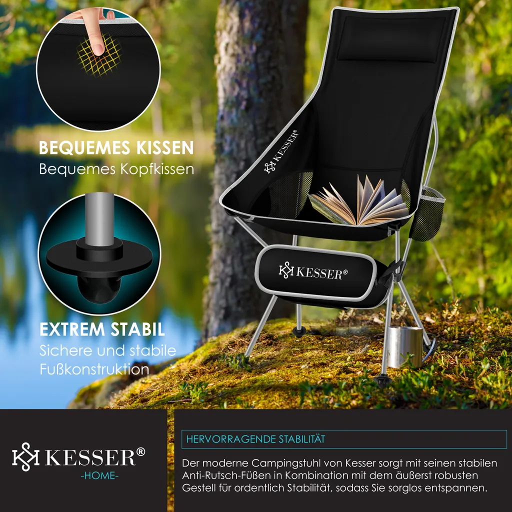 KESSER Campingstuhl aus einem atmungsaktiven Netz und wasserabweisendem Polyester, robustes Aluminiumgestell sorgt für eine Belastbarkeit bis 120Kg, Inkl. Extras wie integriertem Getränkehalter, Tragetasche, Seitentasche und Karabinerhaken