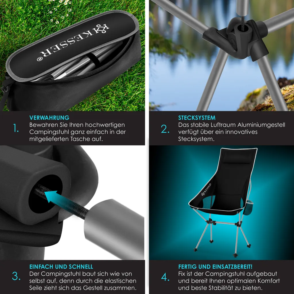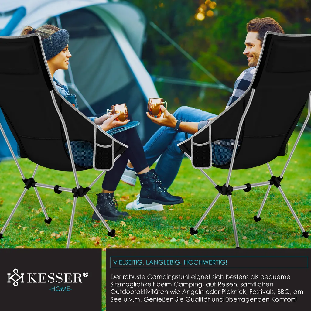VIELSEITIG EINSETZBAR: Mit diesem Campingstuhl mit Tragetasche von KESSER, der perfekt für Campingausflüge, Sportveranstaltungen und Gartenpartys geeignet ist, haben Sie immer eine bequeme Sitzgelegenheit zur Hand, ganz egal, wo Sie sich gerade befinden. Das robuste Zeltstangenstruktur aus Aluminium sorgt zudem für Stabilität und einen festen Stand.