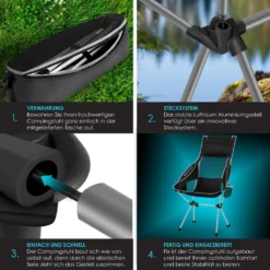 SEKUNDENSCHNELL AUFGESTELLT: Zeltstangen Struktur aus Aluminium Das Aufbauen Ihres Campingstuhls könnte nicht einfacher sein! Die Stangen müssen nur ineinander gesteckt werden und bereits Sekunden später können Sie sich in Ihren Lieblingsstuhl fallen lassen.