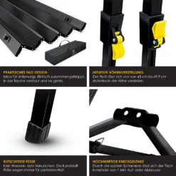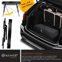 Der Klapptisch von KESSER lässt sich in nur wenigen Schritten schnell und unkompliziert aufstellen. Durch die praktische Tragetasche steht einem ordentlichen Transport in Ihrem Fahrzeug nichts mehr im Wege. Der Auf– und Abbau ist innerhalb von einer Minute erledigt, dadurch haben Sie den Falttisch bei jedem Ausflug immer dabei. Durch die soliden Scharniere und Knickgelenke lässt sich der Tisch in wenigen Schritten Auf– oder Abbauen.