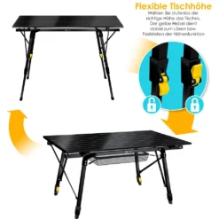 RUTSCHFEST UND HÖHENVERSTELLBAR: Durch das praktische Faltdesign können Sie den Tisch kompakt zusammenpacken und überall mit hinnehmen. Der Tisch lässt sich von 45cm bis 69,9cm stufenlos in der Höhe verstellen, dadurch können auch kleine Kinder gemütlich am Tisch sitzen. Einfach über den gelben Hebel die Höhe feststellen bzw. lösen. Kein Wackeln und kein Verrutschen, denn die Kunststoff-Füße sorgen für einen perfekten Halt auf allen Böden.