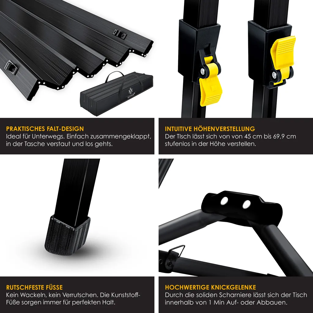 SCHNELLER AUF- UND ABBAU: Der Klapptisch von KESSER lässt sich in nur wenigen Schritten schnell und unkompliziert aufstellen. Durch die praktische Tragetasche steht einem ordentlichen Transport in Ihrem Fahrzeug nichts mehr im Wege. Der Auf- und Abbau ist innerhalb von einer Minute erledigt, dadurch haben Sie den Falttisch bei jedem Ausflug immer dabei. Durch die soliden Scharniere und Knickgelenke lässt sich der Tisch in wenigen Schritten Auf- oder Abbauen.