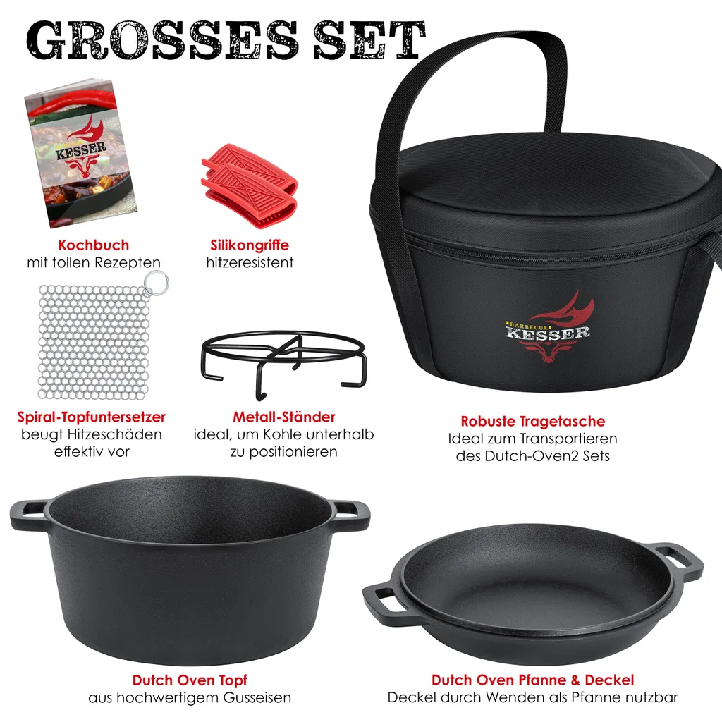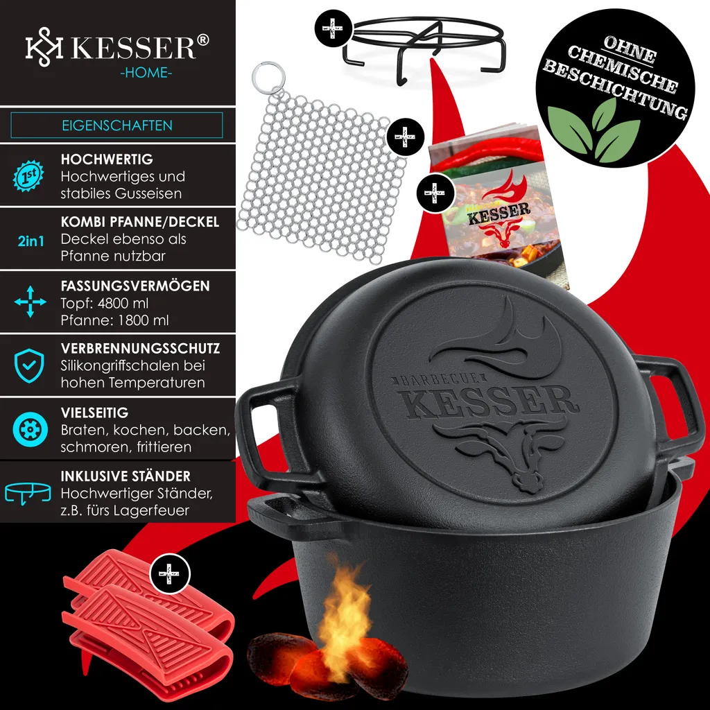 KESSER 2in1 Dutch Oven BBQ aus Gusseisen mit hitzebeständigem Schürhaken, Deckel mit Tragehenkel, 4,8L Fassungsvermögen im Topf sowie 1,8L in der Pfanne (Deckel als Pfanne nutzbar), ohne chemische Beschichtung dafür inkl. Kochbuch