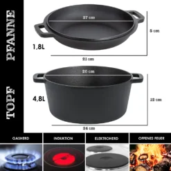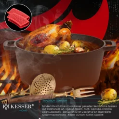 Mit dem Dutch Oven Set von KESSER sind Sie optimal für Ihr nächstes Outdoor Erlebnis ausgerüstet, denn mit dem hochwertigem Set aus Gusseisen können Sie auch bei offener Flamme köstliche Speisen zubereiten. Aber auch im Innenbereich können Sie leckere Köstlichkeiten auf Ihrem Herd zaubern. Ganz egal ob ein Gasherd, Induktionsherd oder Elektroherd – Ihre Speisen werden Ihnen und Ihren Gästen bestens schmecken.