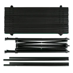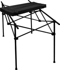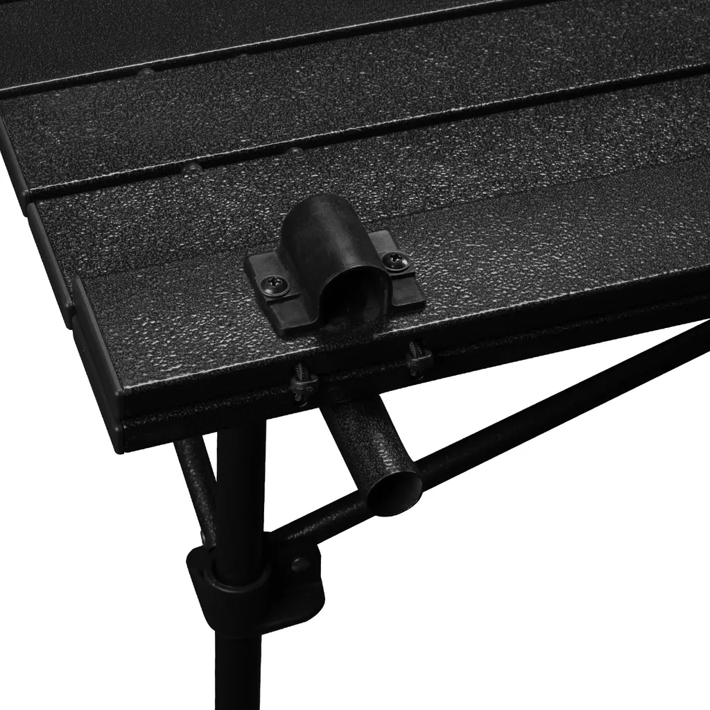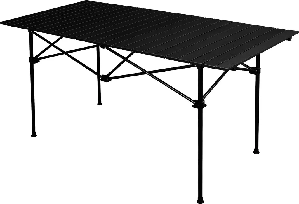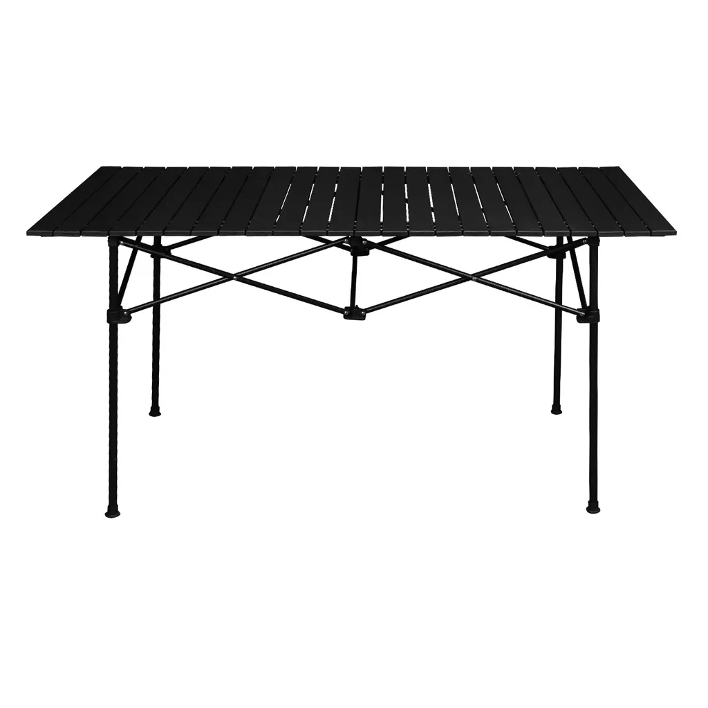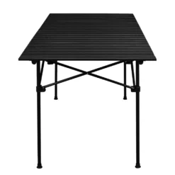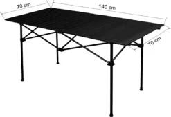 Zusammengefaltet verbraucht er weniger Raum als ein gewöhnlicher Tisch, ist zudem leicht im Kofferraum mitzunehmen und in der mitgelieferten Tasche verstaut einfach zu tragen. Die Tischplatte besteht aus einzelnen Lamellen aus Aluminium, die zusammengerollt werden können. Durch das einteilige und faltbare Metall-Gestänge steht der Tisch stabil. Die großen Plastikfüße sorgen dafür, dass er bei Belastung nicht so leicht in den Untergrund einsinkt.