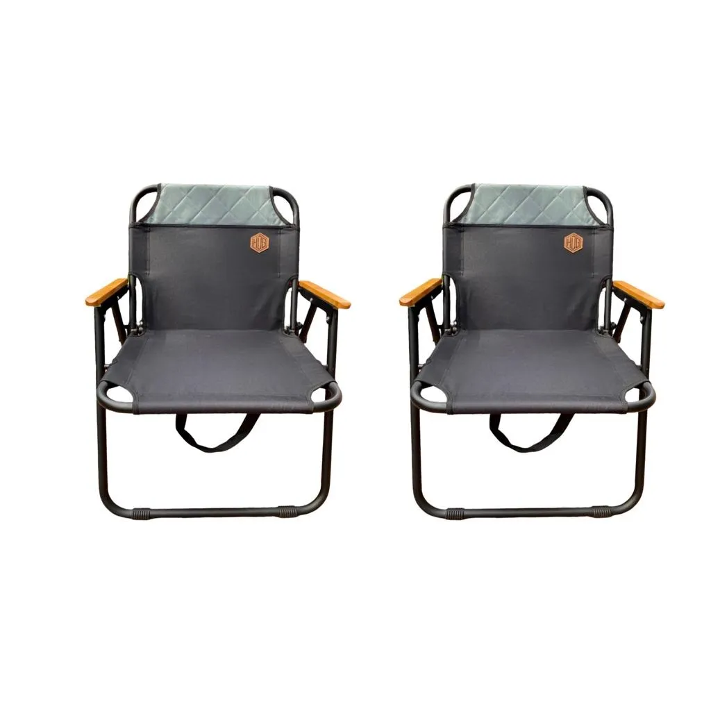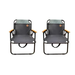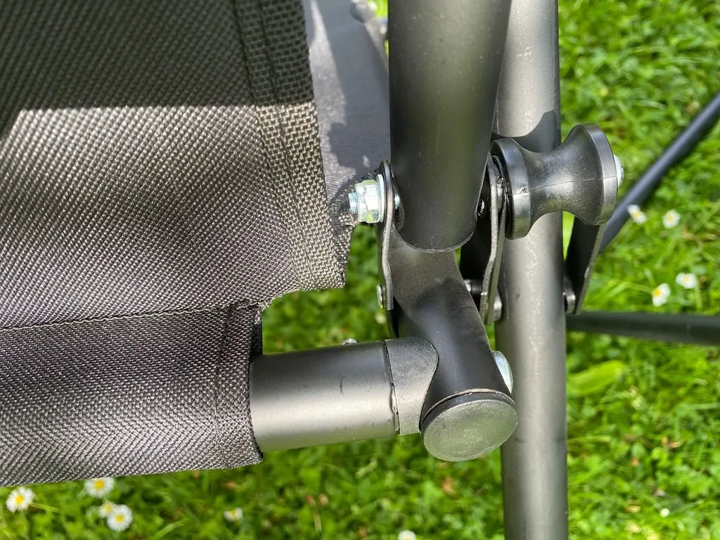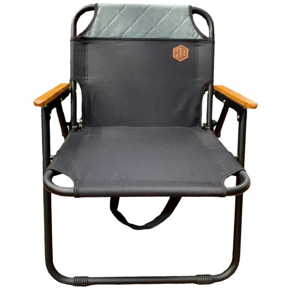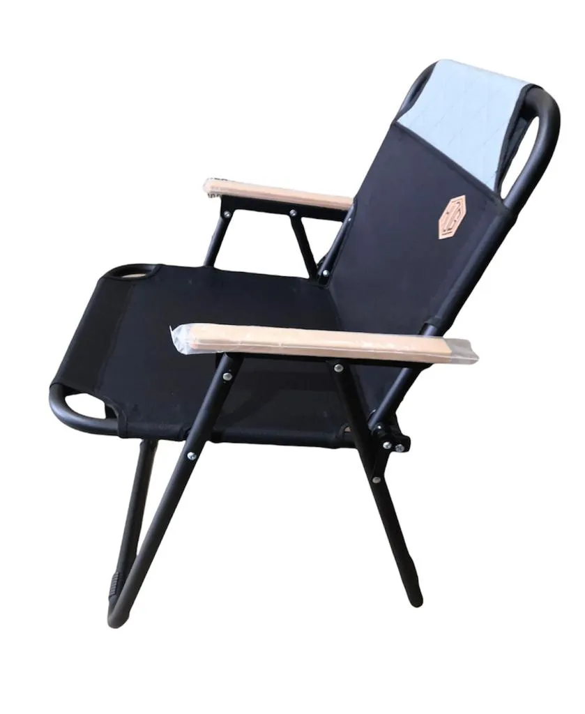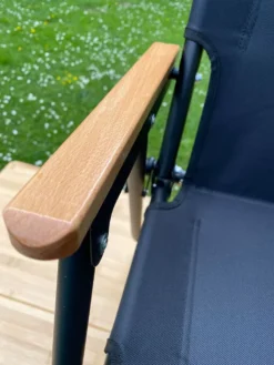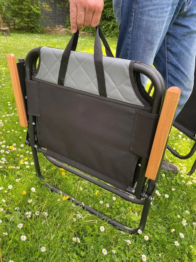 Die Armlehnen aus Echtholz tragen zum angenehmen Sitzgefühl bei. Der Bezugsstoff in schwarz mit grau ist pflegeleicht und unempfindlich und kann mit einem feuchten Tuch abgewischt werden. Der Campingstuhl ist sehr einfach und schnell zusammenklappbar und lässt sich mit zwei Trageschlaufen bequem transportieren.