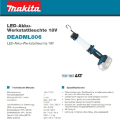 MAKITA Akku-Lampe DML806 | ohne Akku ohne Ladegerät | Hersteller-Nr.: DEADML806 | EAN: 0088381699310 | Produkttyp: Akku-Baustellenlampen | Tiefentladeschutz. Die Maschine schaltet automatisch ab, wenn der Akku fast leer ist. Lampe kann bequem am Gurt getragen werden Immer Licht, genau wo man es braucht Kompaktes Design für hohe Portabilität Nutzbar als Laterne mit 360°-Ausleuchtung und als Taschenlampe mit gebundeltem Lichtstrahl Mit Softgriff Lieferung im Karton ohne Akku, ohne Ladegerät | Kategorie: Akku-Werkzeuge > Akku-Baustellenlampen