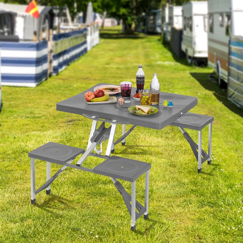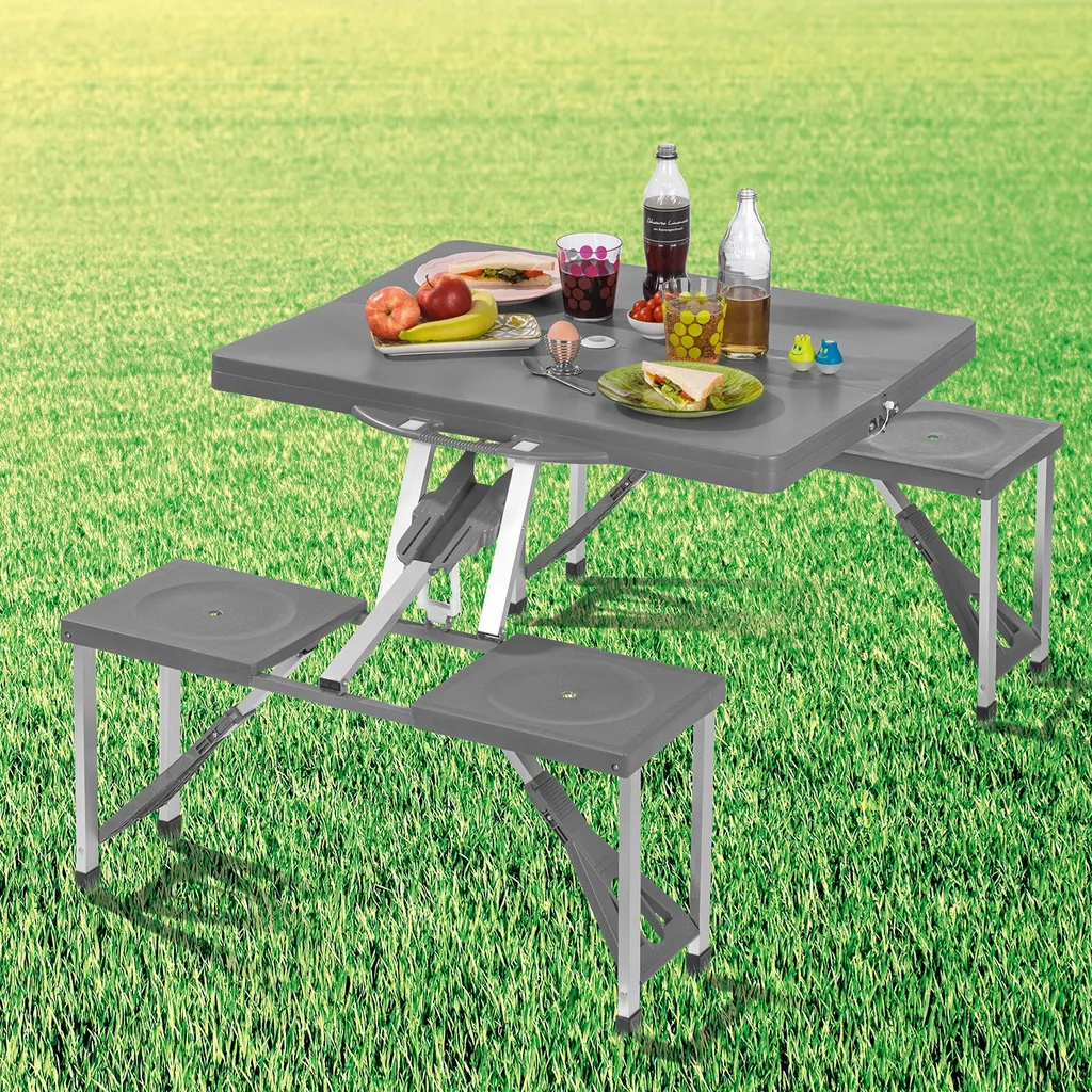 Aus robustem und wetterfestem Material gefertigt, tragen die Stühle bis zu 100 kg, während die Tischplatte bis zu 30 kg belastbar ist. Scheint die Sonne zu stark, lässt sich außerdem noch ein Sonnenschirm mithilfe der integrierten Halterung am Tisch befestigen. Nach dem Einsatz lässt sich die praktische Sitzgruppe schnell und unkompliziert wieder zusammenfalten und im handlichen Koffer verstauen, bereit für die nächste Gelegenheit, mit Freunden beisammenzusitzen!