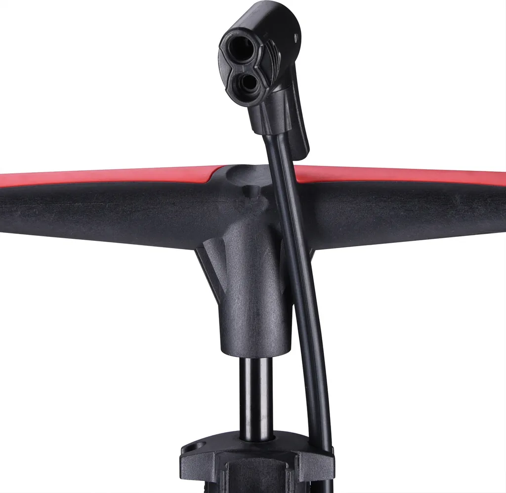 Zusätzlich befindet sich an der Standpumpe ein Manometer, welches Messwerte 0 von bis 7 bar anzeigt. Um ein bequemes Aufpumpen zu ermöglichen, beträgt die Höhe der Fahrradpumpe 58 cm und dank der ergonomischen Griffe ist ein sicherer Halt gegeben. Zur zusätzlichen Stabilität dient ein Standfuß, welcher schnell und einfach bei Nichtgebrauch eingeklappt werden kann.