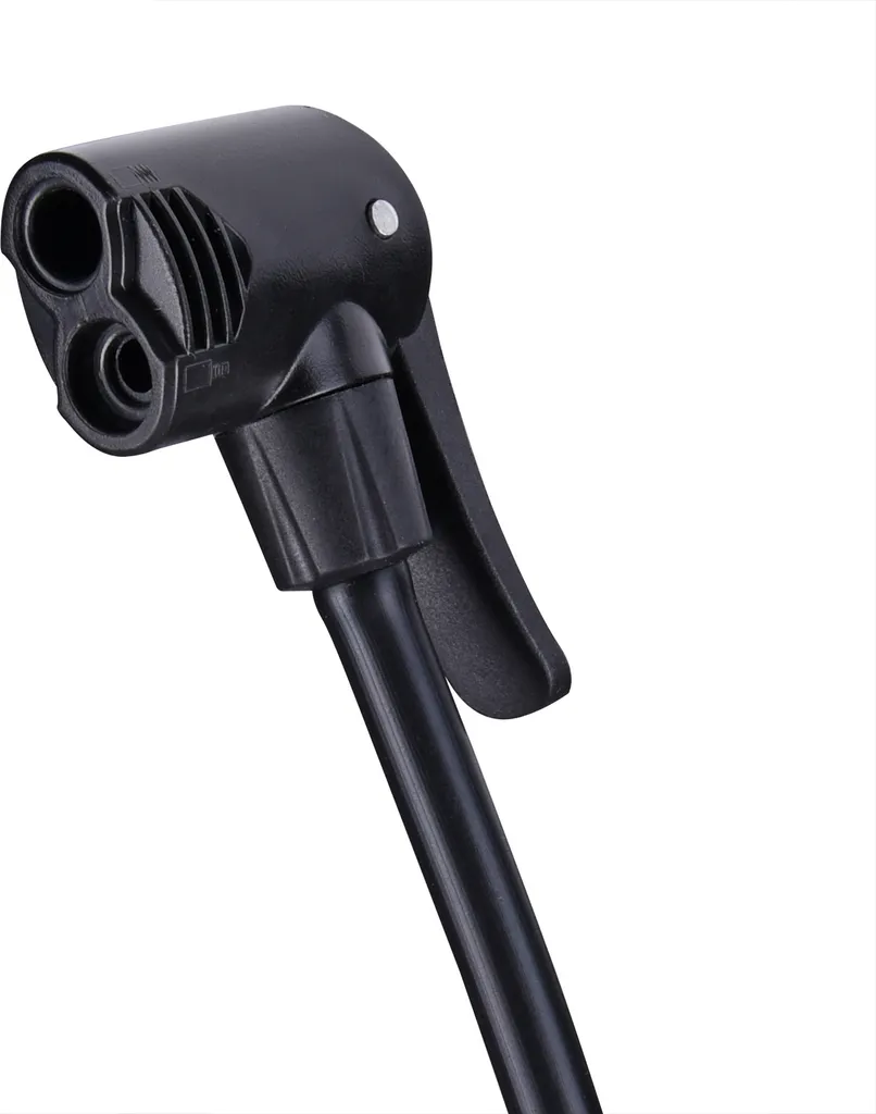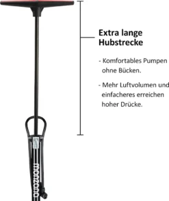 Die Luftpumpe besteht aus robusten Aluminium und Stahl in Schwarz/Silber und überzeugt durch seinen extra langen 60 cm/100 cm Schlauch mit Feststellhebel.