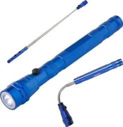 Ein praktischer Helfer für Werkstatt und Garten, für Arbeit und Freizeit Solide Metallkonstruktion für höchste mechanische Belastbarkeit und lange Lebensdauer 3 leuchtstarke LEDs mit einer Nachleuchtweite von bis zu 10 m Teleskopierbarer Flexreflektor zur Beleuchtung auch schwer zugänglicher Stellen erreichbare Stellen Metallclip zum Anbringen in der Tasche oder hinter dem Gürtel Max. Gesamtlänge: 580 mm Lichtstrom: 21 lm Leuchtdauer: ca. 8 Stunden Energiequelle: 4x LR44 Batterien (im Lieferumfang enthalten) praktischer Magnetkopf = Gebrauch als Teleskopmagnet! Als Geschenk für Heimwerker geeignet