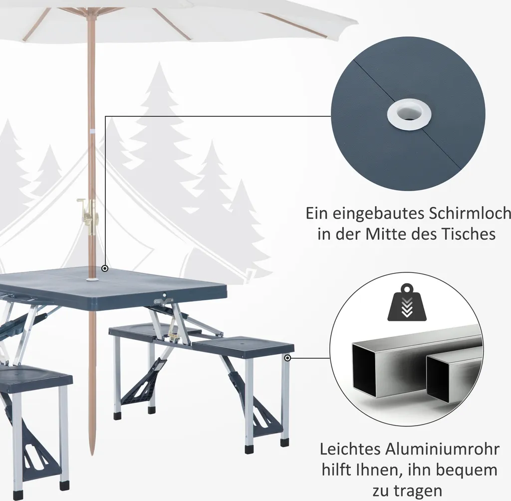 · Lieferumfang: 1 x Campingtisch, 1 x Artikelanleitung (Achtung: Der Sonnenschirm ist nicht im Lieferumfang enthalten.)