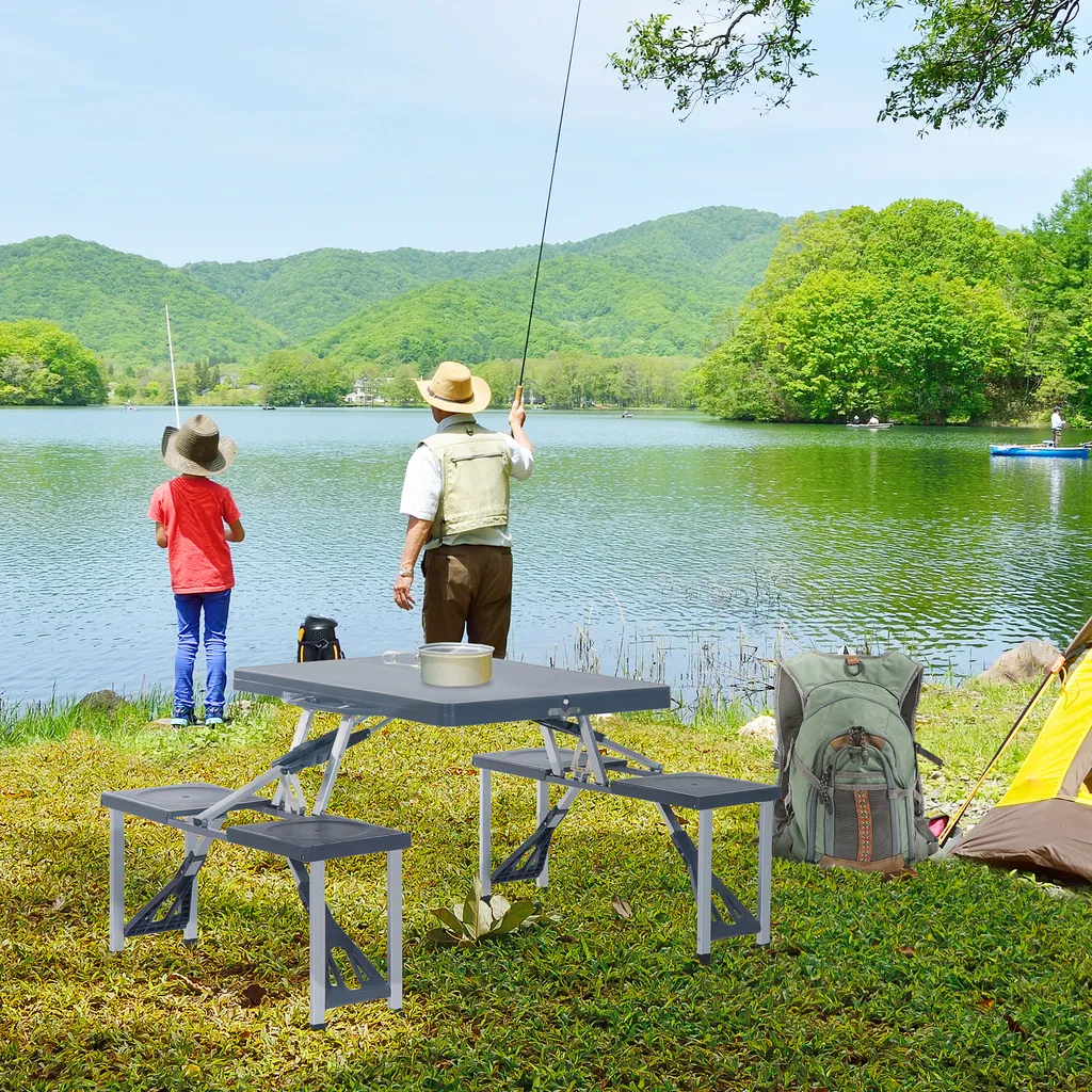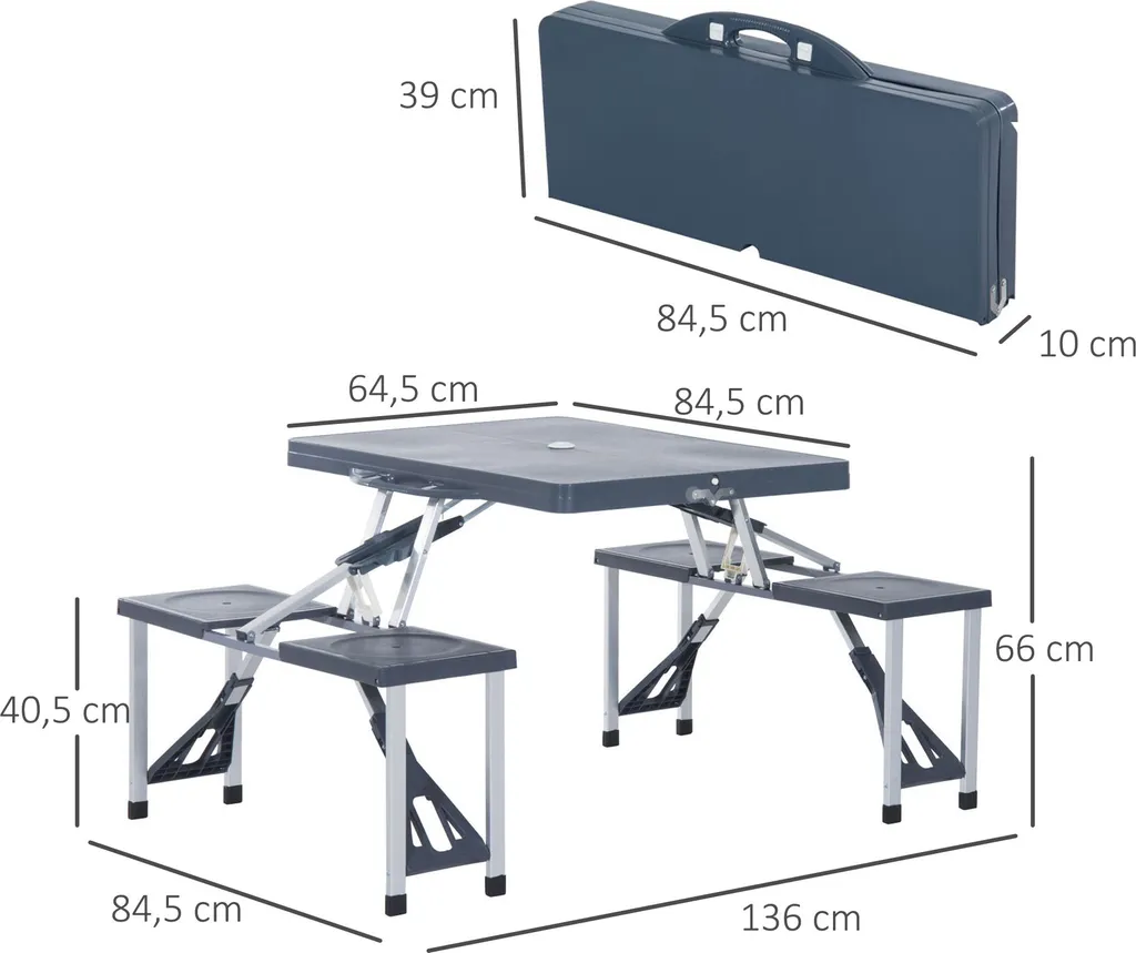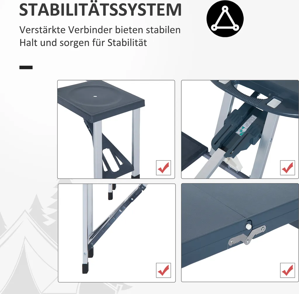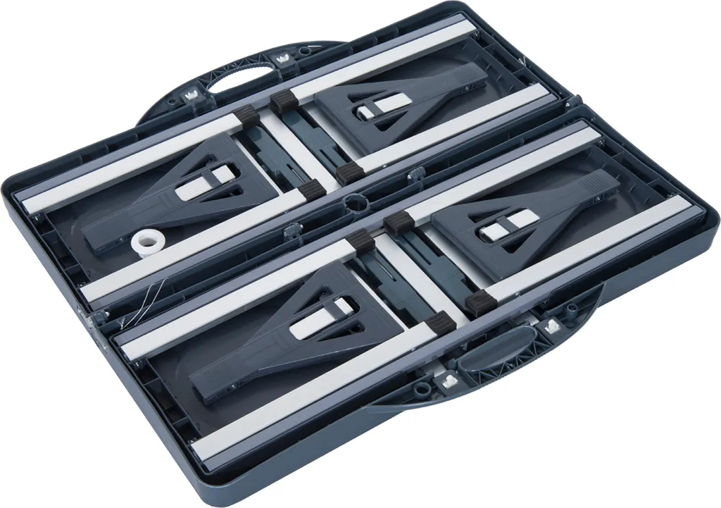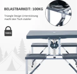 Unser zusammenklappbarer Campingtisch Alu ist trotz seines geringen Eigengewichts überaus stabil und robust. Mit einem Eigengewicht von 6,6 kg sollte der Gartentisch mit 4 Sitzen in keinem Camping-Accessoire fehlen. Jeder Stuhl ist bis zu 100 kg belastbar und bietet somit hohe Stabilität. In der Mitte es Tischs befindet sich ein Loch, in dem ein Sonnenschirm durchgesteckt und aufgespannt werden kann. Wird dieser nicht benötigt, kann das Loch mithilfe einer Abdeckung verschlossen werden. Nicht nur für den eigenen Garten oder zum Camping, sondern auch für unterwegs ist der Campingtisch Alu besonders geeignet, da eine Klappfunktion integriert ist, sodass er schnell zusammen- und auseinander gebaut werden kann.