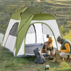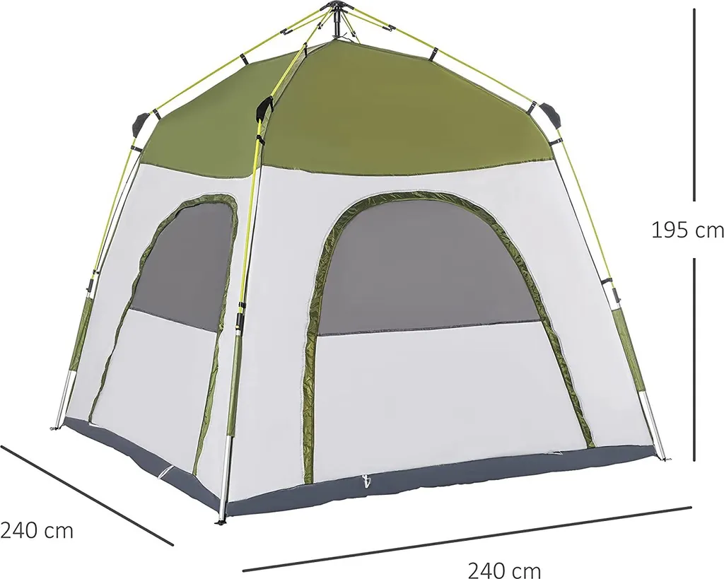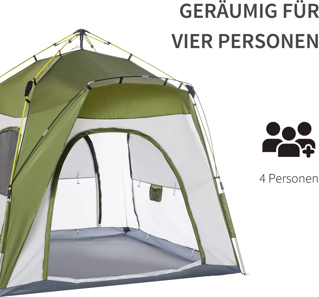 Dieses Bivvy-Zelt von Outsunny ist perfekt, um dich vor Regen und Sonne zu schützen. Mit einem wasserdichten 190T-Polyestergewebe und flexiblen Gestell aus Aluminium und Glasfasern hält Sie dieses Instant-Zelt trocken und vor Wetter geschützt. Das 5-Personen-Zelt ist außerdem leicht auf- und auszuklappen: Dank der vorfixierten Gestelle und eines hydraulischen Druckmechanismus kann es mithilfe des Knopfes automatisch auf- und abgebaut werden. Perfekt für Campinganfänger.