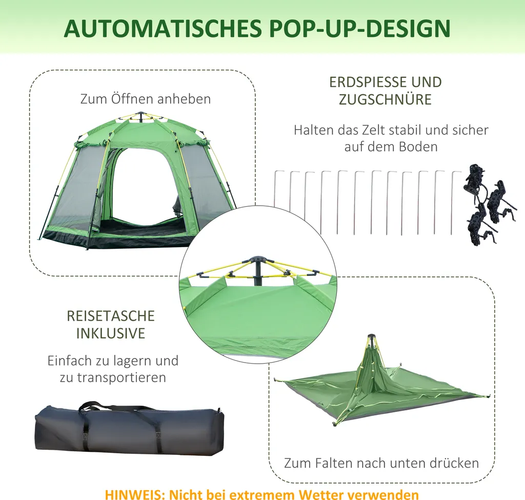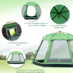 Dieses geräumige Campingzelt von Outsunny bietet Ihnen einen sicheren, warmen und trockenen Unterschlupf, wenn Sie zu zweit die Natur genießen und im Freien übernachten. Die 2-lagige Tür (Netz + Silikon) mit Reißverschluss bietet einen einfachen Zugang und sorgt für eine gute Belüftung. Starke Spannseile und Heringe bieten eine hohe Standfestigkeit und Stabilität und dank der mitgelieferten Tragetasche kann das Zelt mühelos auf jedes Abenteuer mitgenommen werden.
