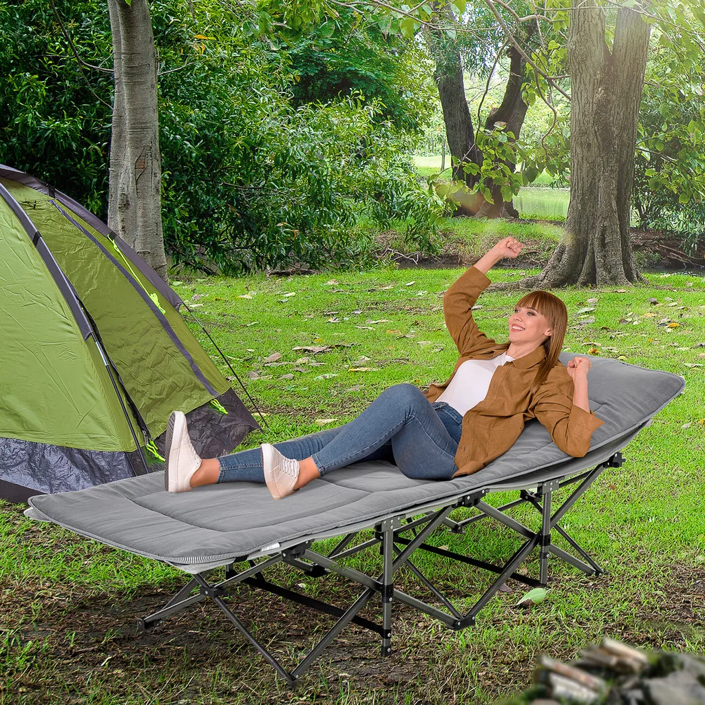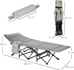 Mit dem tragbaren, faltbaren Campingbett von Outsunny haben Sie unterwegs immer einen bequemen Platz zum Ausruhen. Das faltbare Campingbett hat eine praktische Seitentasche, in der Sie kleine Gegenstände leicht aufbewahren können. Der Stahlrahmen und das strapazierfähige Oxford-Gewebe können bequem bis zu 150 kg tragen. Es ist außerdem sehr vielseitig und kann für Camping, als Gästebett oder für alles dazwischen verwendet werden.