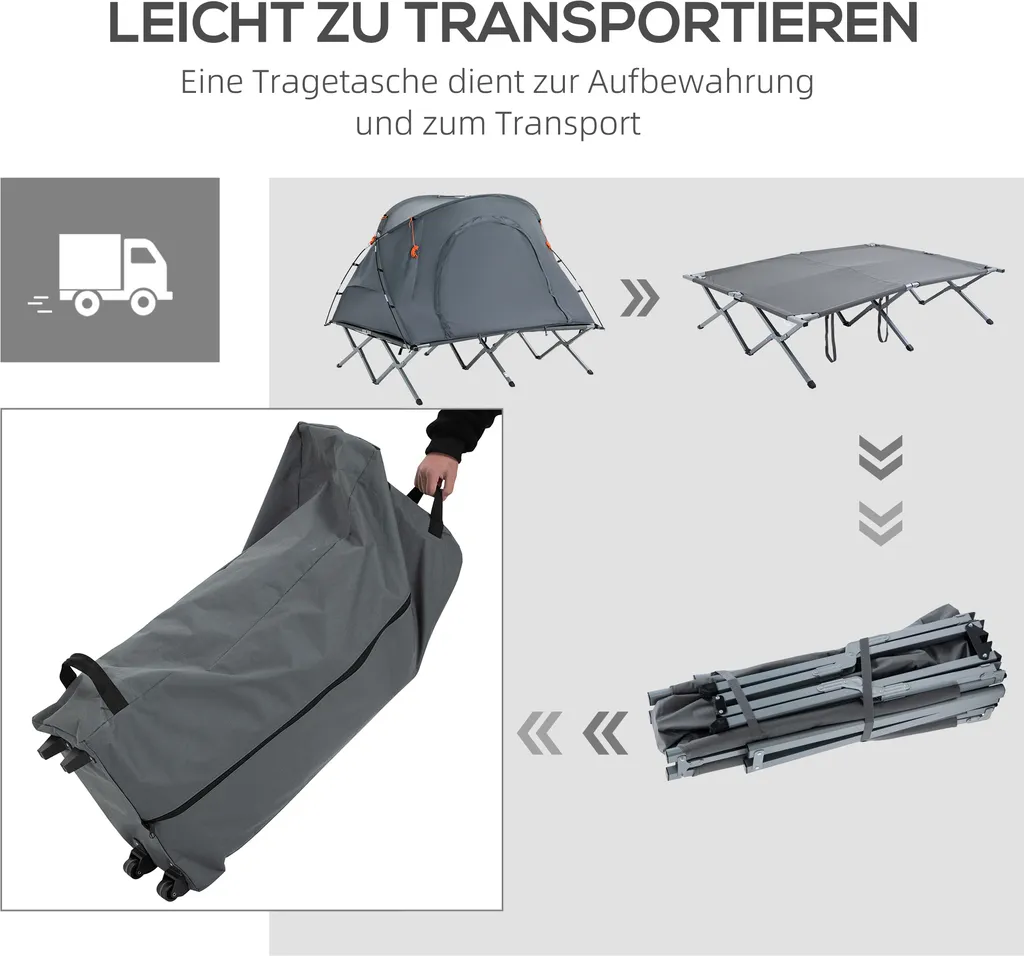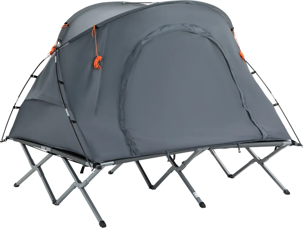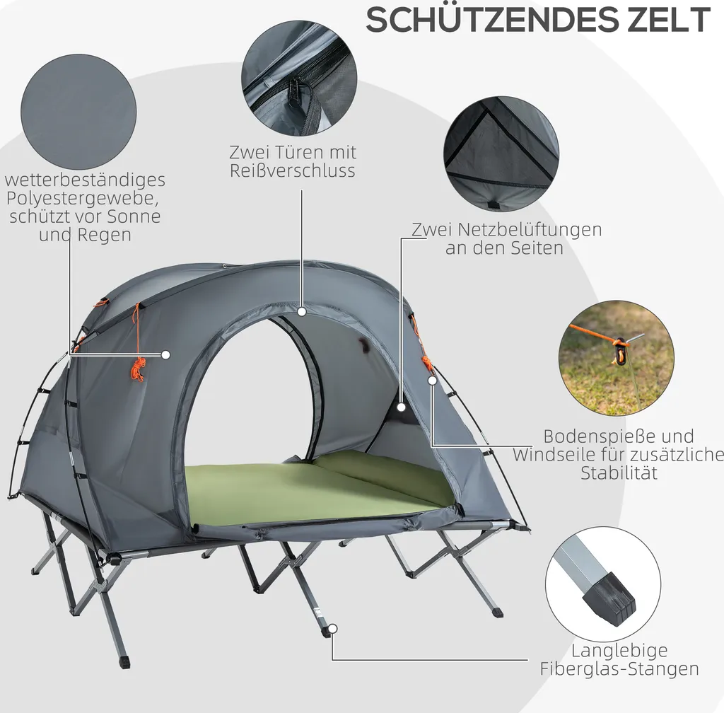 Schlafen Sie bequem und wachen Sie erholt auf – mit diesem 2-in-1-Campingzelt von Outsunny! Dank des erhöhten Aufbaus wird schützender Abstand zum feuchten, kalten Boden hergestellt, sodass Sie immer trocken und warm bleiben. Das Set besteht aus einem Zelt, einer aufblasbaren Matratze und einem Feldbett für 2 Personen, die jeweils auch separat genutzt werden können. Ein besonders einfacher und schneller Zusammenbau verschafft Ihnen mehr Zeit, Ihren Campingausflug in vollen Zügen zu genießen.