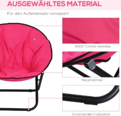 Dieser gemütliche Klappsessel ist sowohl für den Gebrauch im Innen- als auch im Außenbereich geeignet. Durch sein geringes Gewicht und kleines Klappmaß lässt er sich bequem transportieren und bietet Ihnen bei Ihren Outdoor-Aktivitäten einen bequemen Ort zum Sitzen und Entspannen. Der pflegeleichte 600D-Oxfordstoff, der robuste Metallrahmen und die großzügige Polsterung machen diesen Klappsessel zum perfekten Begleiter für Groß und Klein, ganz egal wo!