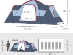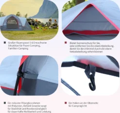 Dieses 5-6 Personen Zelt ist ideal für Campingausflüge, Übernachtungen oder Wanderungen. Das geräumige Zelt bietet genug Platz für Pärchen oder Familien und der Wetterfeste Bezug schützt sie auf Ihrem Trip vor den Elementen und gefährlicher UV-Strahlung. Die hochwertigen Materialien sind rostbeständig und langlebig. Im Lieferumfang enthalten sind Heringe und eine Transporttasche für leichten Transport.