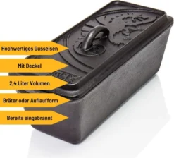 Diese Form eignet sich als Bräter, Auflaufform oder zum Brot- und Kuchenbacken Die Eigenschaften des Gusseisens überzeugen im Ofen zuhause und in der Outdoor-Küche