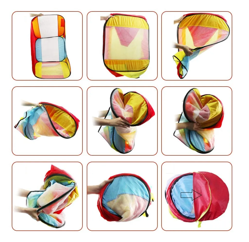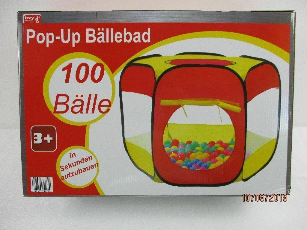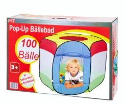 Das Pop-Up Bällebad verspricht viel Spaß für Kinder. Das Spielcenter bietet zwei Eingänge und vier Fenster. Mit dabei sind 100 Bälle mit einem Durchmesser von ca. 6 cm. Seitlich befindet sich ein verschließbarer Eingang und oben eine Dachluke. Die Maße des Spielhauses betragen ca. 90 x 70 x 90 cm. Das Material besteht zu 100% aus Polyester.