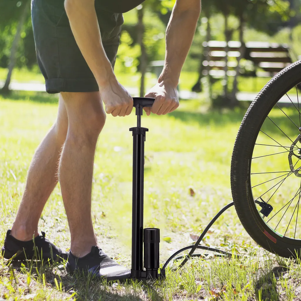 Diese universell einsetzbare Hochdruck-Standpumpe erleichtert das Aufpumpen und spart Zeit – egal ob Fahrradreifen, Luftmatratze oder FuĂźball. Die Fahrradpumpe ist einfach bedienbar: Doppelpumpenkopf mit Hebel befestigen, StandfuĂź ausklappen, daraufstellen und pumpen. Die Fahrradluftpumpe ist fĂĽr Reifenventile aller Art geeignet. Mithilfe des gut lesbaren Manometers ist der Reifendruck sofort erkennbar. Die kompakte Ballpumpe verfĂĽgt zudem ĂĽber 3 Adapter fĂĽr aufblasbare Spiel- und Sportgeräte.