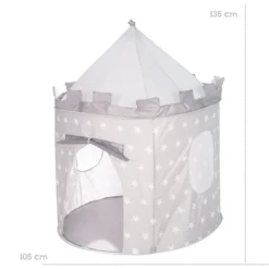 Das roba Kinderspielzelt bietet mit einem Durchmesser von 105 cm und einer Höhe von 135 cm ausreichend Platz zum Spielen fĂĽr drinnen und drauĂźen. Ob als Ritterburg im Kinderzimmer oder als Wind- und Sonnenschutz im Garten – dieses Kinderzelt ist vielseitig einsetzbar. Das runde turmartige Kinderzelt hat zwei Fenster und eine Fahne auf dem pyramidenförmigen Dach. Die TĂĽröffnung des Spielhauses kann hochgerollt und festgebunden werden. Dach und Boden werden durch zwei flexible Ringe gespannt und von vier Fiberglasstangen gehalten. Das Zelt aus wasserabweisendem Nylonstoff ist abwischbar und kinderleicht auf- und wieder abgebaut. Die Lieferung des Kinderschlosses erfolgt mit einer praktischen Aufbewahrungstasche mit Tragegriffen.