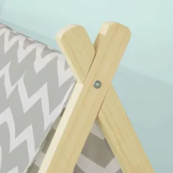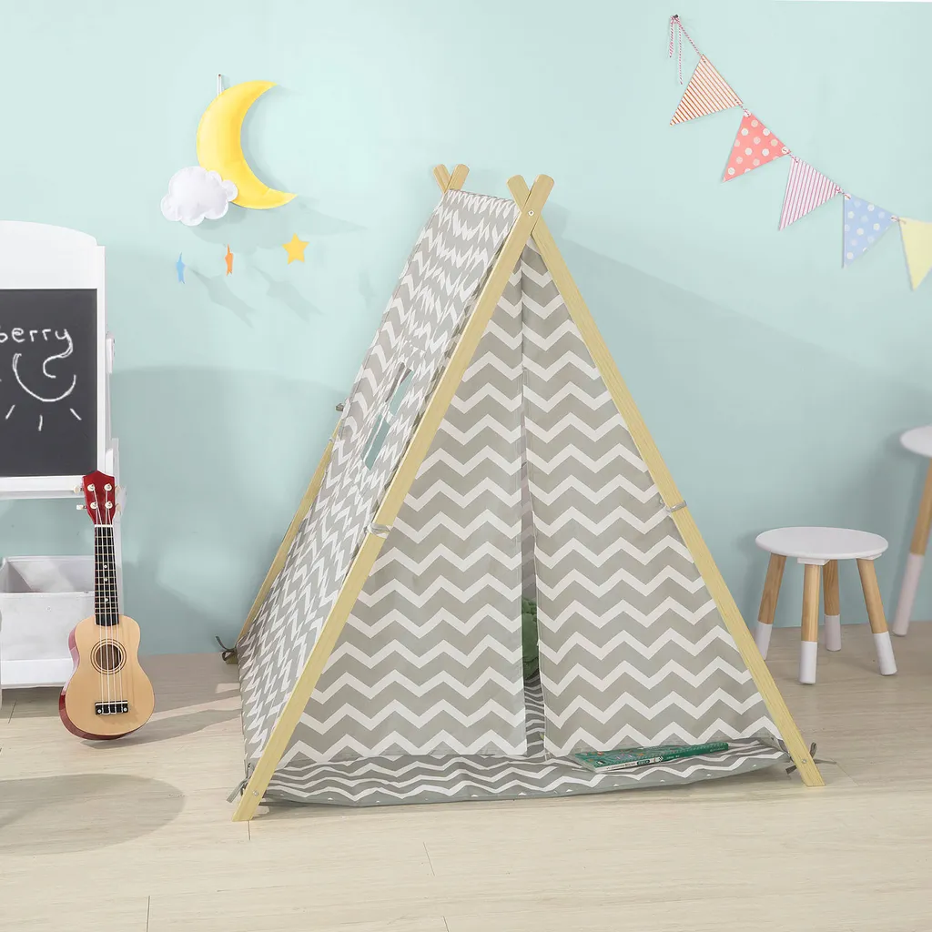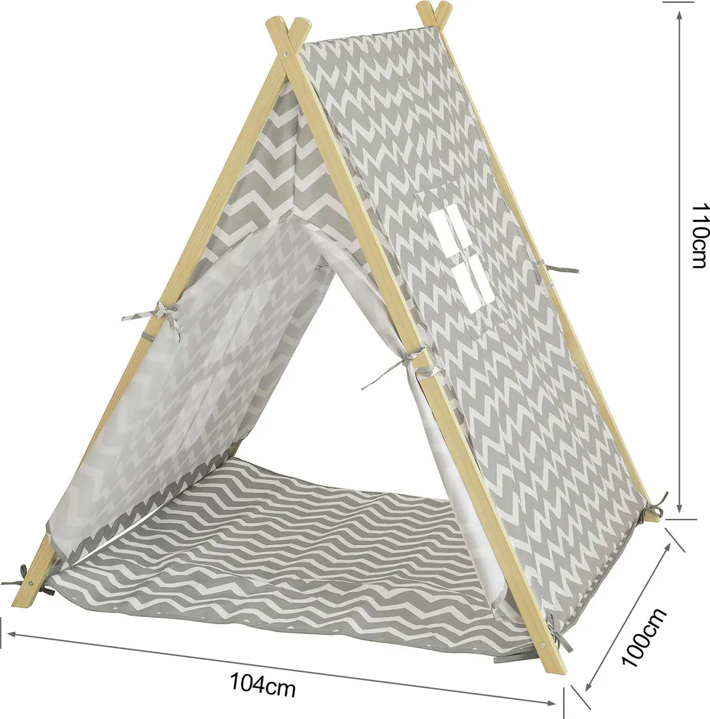 Das Spielezelt besteht aus Polyester und stabilen Stangen aus Holz.