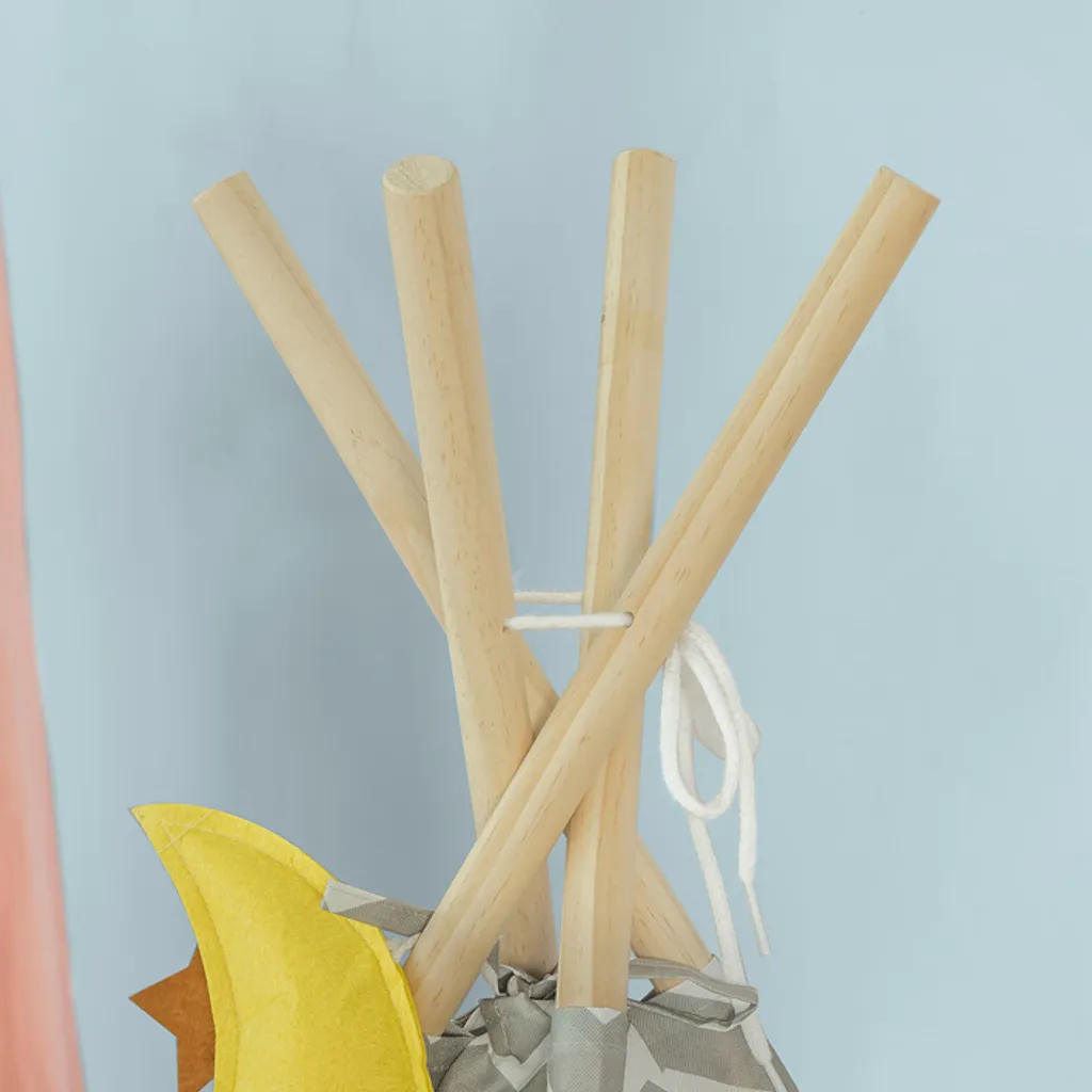 Das Spielezelt besteht aus reißfestem Polyester und stabilen Stangen aus Holz.