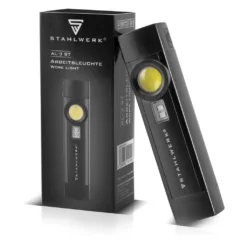 Die leistungsstarke STAHLWERK LED Arbeitsleuchte AL-3 ST mit integriertem Akku ist die ideale Alternative zu kabelgebundenen Leuchten. Die aufladbare Taschenlampe verfügt über 4 Modi (XPE starkes Licht / COB starkes Licht / COB schwaches Licht / 395nm UV-Licht) und überzeugt durch eine extrem hohe Leuchtkraft. Durch die verschiedenen Funktionen kann die Helligkeit individuell auf die erforderlichen Bedürfnisse vor Ort abgestimmt und selbst bei schlechten Lichtverhältnissen ausreichend Licht geschaffen werden. Der energieeffiziente 1200 mAh Lithium-Ionen-Akku ist optimal auf die leuchtkräftigen LEDs abgestimmt und bietet langanhaltend perfekte Beleuchtung. Aufgeladen wird der Hochleistungs-Akku mit einem im Lieferumfang enthaltenen USB-Kabel. Gefertigt aus hochwertigem Aluminium / ABS-Kunststoff ist die robuste LED Taschenlampe stoß- und spritzwassergeschützt. Mit einem Gewicht von nur 88 Gramm lässt sich die LED Lampe unkompliziert positionieren, leicht transportieren und einfach verstauen. Die praktische Arbeitslampe eignet sich überall dort, wo eine Lichtversorgung unabhängig von der nächsten Stromquelle benötigt wird, wie zum Beispiel auf der Baustelle, bei Renovierungsarbeiten, im Auto, beim Camping, in Schrebergärten uvm.