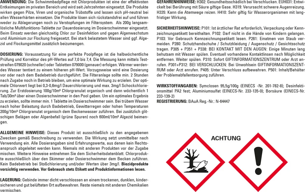 ANWENDUNG: Wasserpflegemittel zur Desinfektion und gegen Algenwachstum. Langsamlösliche Multifunktions-Tablette zur Dauerdosierung. Beim Einsatz wird Chlor und ein Flockungsmittel freigesetzt.