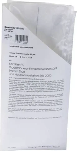 Eigenschaften: · Filtereinsatz für Kerzenfilter · 5 Stück in einer Vorratstasche · Filtergewebe aus Nylon für Drufi DFF und Drufi FF · Maschenweite 95 µm · Mit zusätzlich einem Filtertasen-O-Ring Modelle Drufi 2315 bis 04/2011 SY200025900